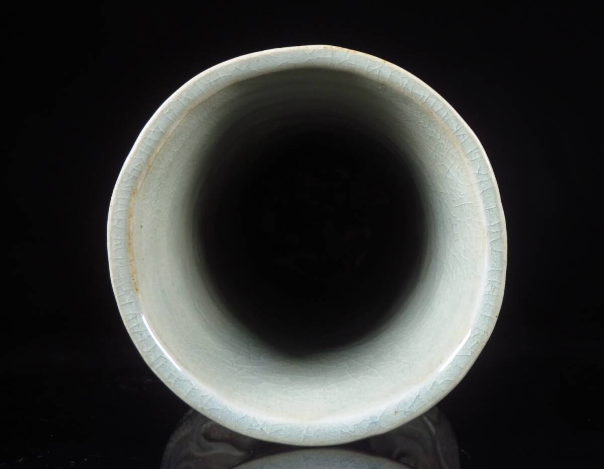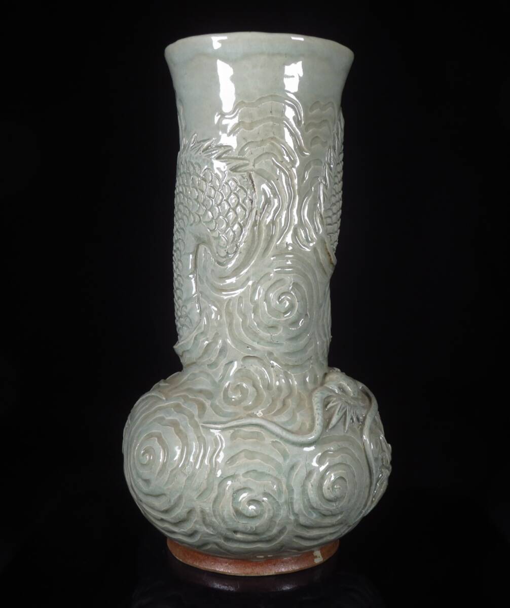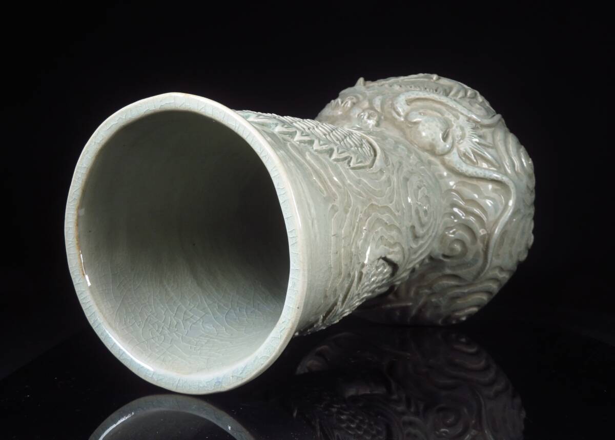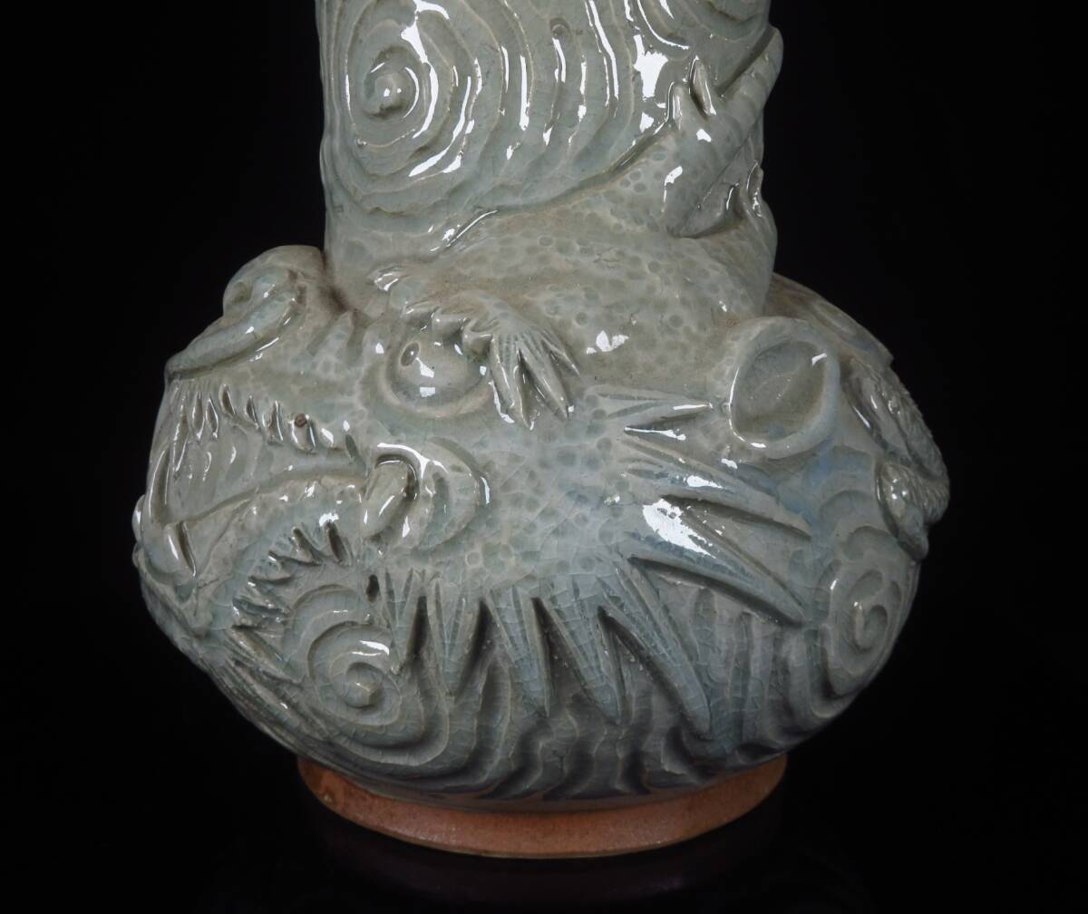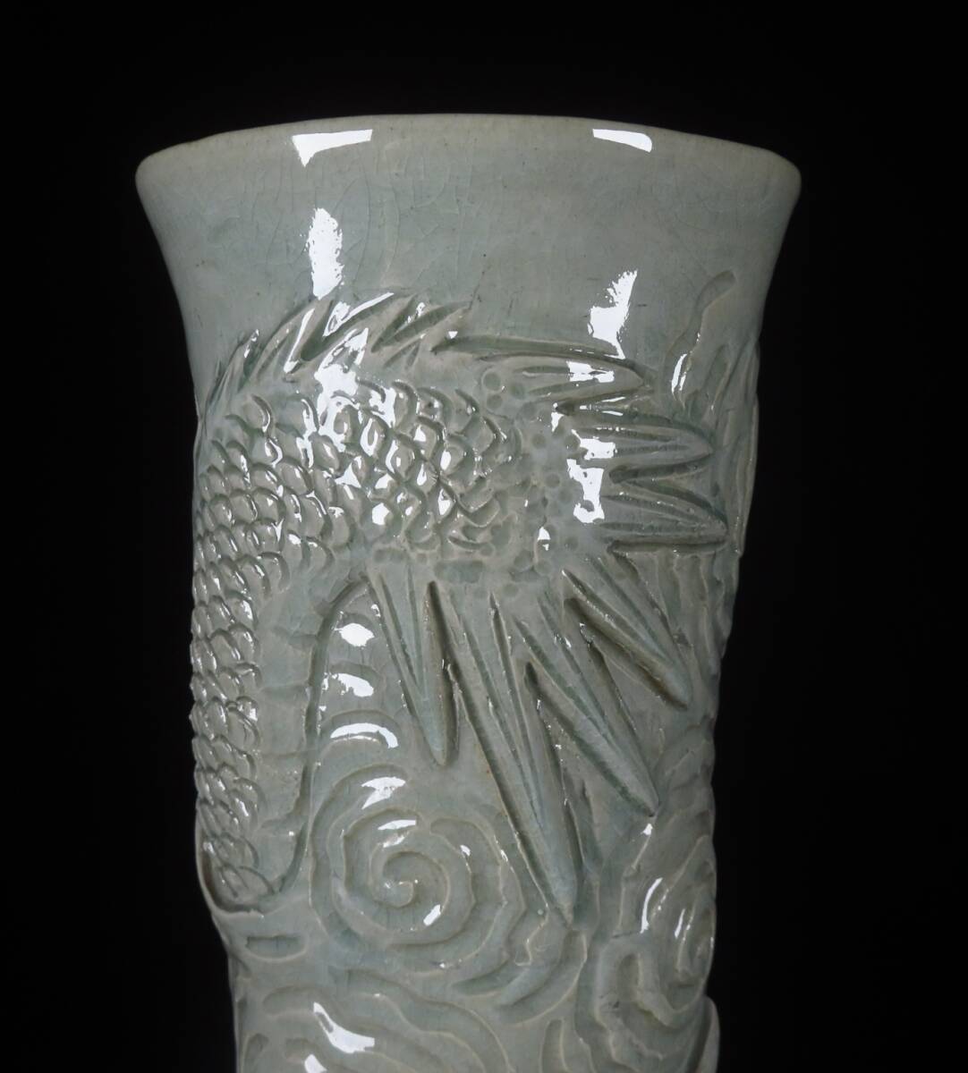 【SAKURAYA】迫力ある希少な作品【青磁龍図花入/唐津焼の名工 中野霓林】細密彫刻 陽刻 花瓶 飾壺 壷 作家 在銘 骨董品 古美術品 高さ39cm 收藏