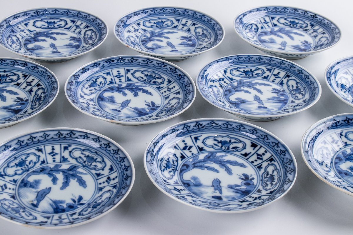 【うつわ】 古伊万里 染付芙蓉手花鳥文小皿 10客 明治時代 E2261 バラ売り可能です 古美術 骨董 古玩 陶磁器 和食器 懐石 料亭 收藏