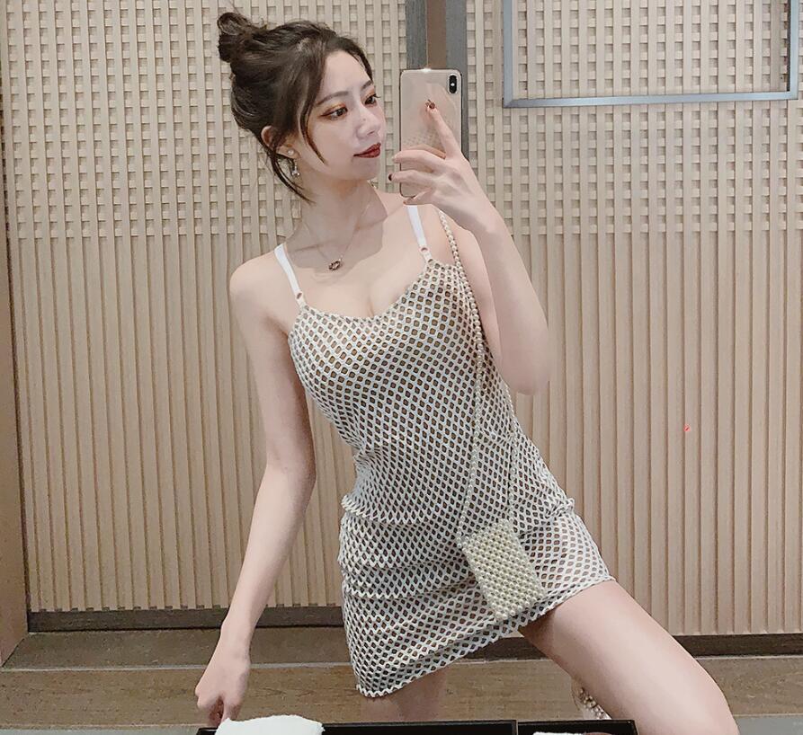 大人気セクシー エロかわ ぴったりボディライン 総柄*キャミソール*オープンネック*タイトワンピース*白×ベージュ 伸縮性有り 收藏