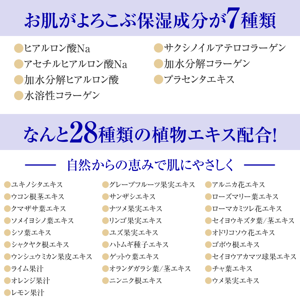 | 水、BG、グリセリン、メチルグルセス-10、エタノール、温泉水、ヒアルロン酸Na、アセチルヒアルロン酸Na、加水分解ヒアルロン酸、水溶性コラーゲン、サクシノイルアテロコラーゲン、加水分解コラーゲン、プラセンタエキス、ユキノシタエキス、ハトムギ種子エキス、アルニカ花エキス、ローマカミツレ花エキス、オドリコソウ花エキス、セイヨウアカマツ球果エキス、シャクヤク根エキス、ゴボウ根エキス、ニンニク根エキス、ウコン根茎エキス、セイヨウキズタ葉/茎エキス、オランダガラシ葉/茎エキス、ゲットウ葉エキス、クマザサ葉エキス、ソメイヨシノ葉エキス、シソ葉エキス、チャ葉エキス、ローズマリー葉エキス、ウンシュウミカン果皮エキス、ライム果汁、オレンジ果汁、レモン果汁、グレープフルーツ果実エキス、ナツメ果実エキス、リンゴ果実エキス、ユズ果実エキス、ウメ果実エキス、サンザシエキス、ヒドロキシエチルウレア、ココイルアルギニンエチルPCA、ポリクオタニウム-61、PEG-20、ジグリセリン、ヒドロキシエチルセルロース、キサンタンガム、PEG-40水添ヒマシ油、エチドロン酸、水酸化K、ジフェニルジメチコン、ミリスチン酸ポリグリセリル-10、トリエチルヘキサノイン、メチルパラベン、フェノキシエタノール |