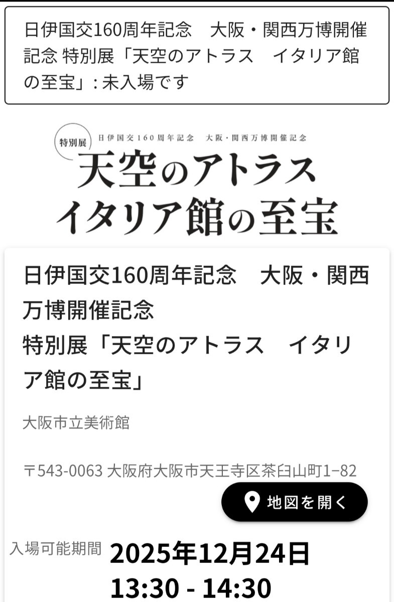 日伊国交160周年 VCGG 天空のアトラス イタリア館の至宝 大阪市立美術館 2枚 入場時間:25年12月24日 13時30分-14時30分 日時指定予約のみ 收藏