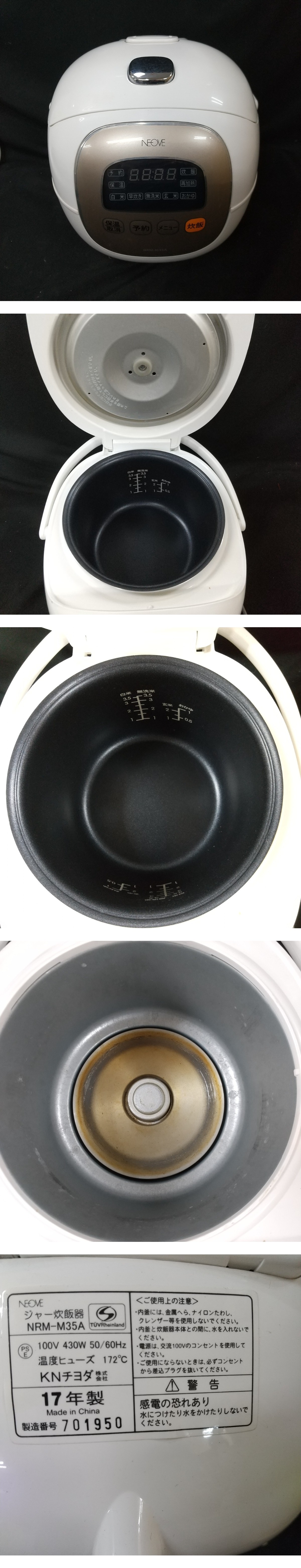 | ※必ず最後までお読みください。 Please be sure to read to the end. 一定要到最后※ | 商品概要 | -95数あるオークションの中からこちらの商品をご覧頂きまして誠にありがとうございます! ※商品説明と注意事項を必ず全てお読み頂いた後にご入札下さい※ 引き続き 安心できる気持ちの良いお取引を心掛けてまいりますのでどうぞ 宜しくお願い致します! 色んなジャンルの商品を多数出品しておりますので、こちらをクリックしてご覧ください!! 東京都公安委員会 古物商許可 第307781505147号 ◎ネオーブ◎NEOVE NRM-M35A 炊飯器 3.5合 KNチヨダ 通電確認済 即発送 ※最下部にも写真掲載中なので必ずご覧下さい。 【商品概要】 3.5合炊きのコンパクトサイズの炊飯器です。 5つのメニュー(白米、早炊き、無洗米、玄米、おかゆ)と、お知らせメロディ機能を搭載。 マイコン制御で操作もとても簡単。 定格電圧:100V 50Hz/60Hz 消費電力:430W 炊飯容量:3.5合(0.63L) 電源コード長さ:約 1m (コードリール式) 加熱方式:底ヒーター+上蓋ヒーター 保温方式:側面ヒーター+上蓋ヒーター メニュー:白米、早炊き、無洗米、玄米、おかゆ、保温、再加熱、予約 寸法:本体:W224×D268×H227mm、2.3kg、 主要材質:本体:ポリプロピレン、内釜:合金アルミ 【状 態】 写真をよくご確認お願い致します。外装ランク:(B) 【詳細・備考】 写真に写っているものが全てになります。 また、タイトルや本文と写真が異なる場合は写真を正とします。 保管品なので状態判断には個人差があることを予めご了承の上 写真にてご確認ご判断をお願い致します。 譲り受けたお品で当方は専門店ではないので詳細の質問にはお答えできかねます。 また簡単な検品は行っていますが、譲り受けた商品のため欠品等見落としがある場合がございますので保証等はしかねます。 ※返品不可が入札条件となります。 ※中古現状とは動作未確認のジャンク品になります。 ※通電確認とは電源に繋げてONOFFの確認のみになります。 ※バッテリーや電池は消耗品なので経年劣化がある場合もあることをご了承お願い致します。 ※保管品に関しては未使用でも新品ではございませんので、保管期間による劣化等ある場合もございますので、新品をお求めの方はご入札をお控えください。 ※ジャンク品ではなくても中古品の性質上、配送途中や到着後に万が一不備不良が起きうる場合もございますがも保証はできかねますので、返金返品不可をご了承の上ご入札お願い致します。 ※未開封品に関しては中の状態が不明な為、不具合等ございましたらメーカーとご相談お願い致します。保証対象外とさせて頂きますのでこちらでは対応いたしません。 尚、実際の色とパソコンや携帯の画面を通じた色彩は異なる場合もございますのでお気をつけ下さい。 =外観ランク表記= (N)長期保管/未使用品(新品ではございません) (S)数回程度使用の美品 (A)多少の傷、若干の使用感がありますが程度良好の美品 (B)一般的な使用感あります。 (C)汚れ、使用感を感じるがまだまだ使える品物 (D)汚れ、使用感等が見受けられる難有品 (E)ジャンク品 ※大体の目安としてお考え下さい。 新品に近いものをご希望の方や神経質な方のご入札はご遠慮下さい。 ご入札頂いた時点で本文説明文に了承を頂き、商品にご納得して頂いたと当方で判断させて頂きますので 【ノークレーム・ノーリターンがご入札の条件となります】 また、弊社のオークションでは いろんなジャンルで多数出品しておりますので是非ご覧ください(^_-)-〇 ![]() ▶入札の取り消しは受け付けておりません。 落札後の質問やキャンセルも受け付けておりません。 尚、営業時間が9-18時となっておりますのでオークション終了間際や質問内容によっては返答できない場合がございます。 ジャンク商品に関してはいかなる場合も返品返金の対応はできかねます。 落札後のサイズ違いやイメージ違い等のキャンセル、クレーム、返品等はお受けできませんので予めご了承ください。 ご入札の方につきまして、当方にて評価が著しく悪いと判断した場合は、トラブル防止の観点からご入札を取り消させていただく場合がございますので予めご了承ください。 新規IDの方や、いたずら入札と判断した場合、入札削除させていただく場合がございますので、新規の方は質問欄にて購入意思を示してからのご入札をお願い致します。 ※の障害等で入札が不適切に成立した場合は落札された場合でも削除対象になりますことを予めご了承お願い致します。 取り置きは可能ですが物や金額によってはすぐに決済をお願いする場合がございます。 当方大量の商品を管理している為、複数落札の同梱ご希望の方は、「まとめて取引」の依頼を必ず行ってください。 ◆連絡方法◆ ▶当方連絡事項は全て取引ナビを使用しております。 ご連絡先、ご要望等は必ず「取引ナビ」にご入力お願い致します。※ご入札前の場合はdiamonds100ct@yahoo.co.jpまでお願い致します。 ⇩⇩下記の注意事項を必ずお読み下さい。⇩⇩ 