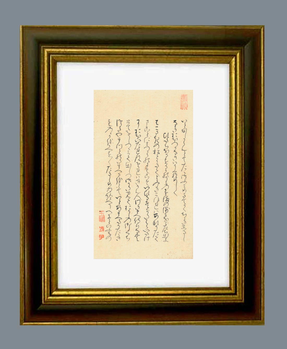 「源氏物語」自筆の大きさ タテ21.8センチ ヨコ12.8センチ。額縁の大きさは タテ37.0センチ ヨコ28.0センチです。額縁は新品です。 |