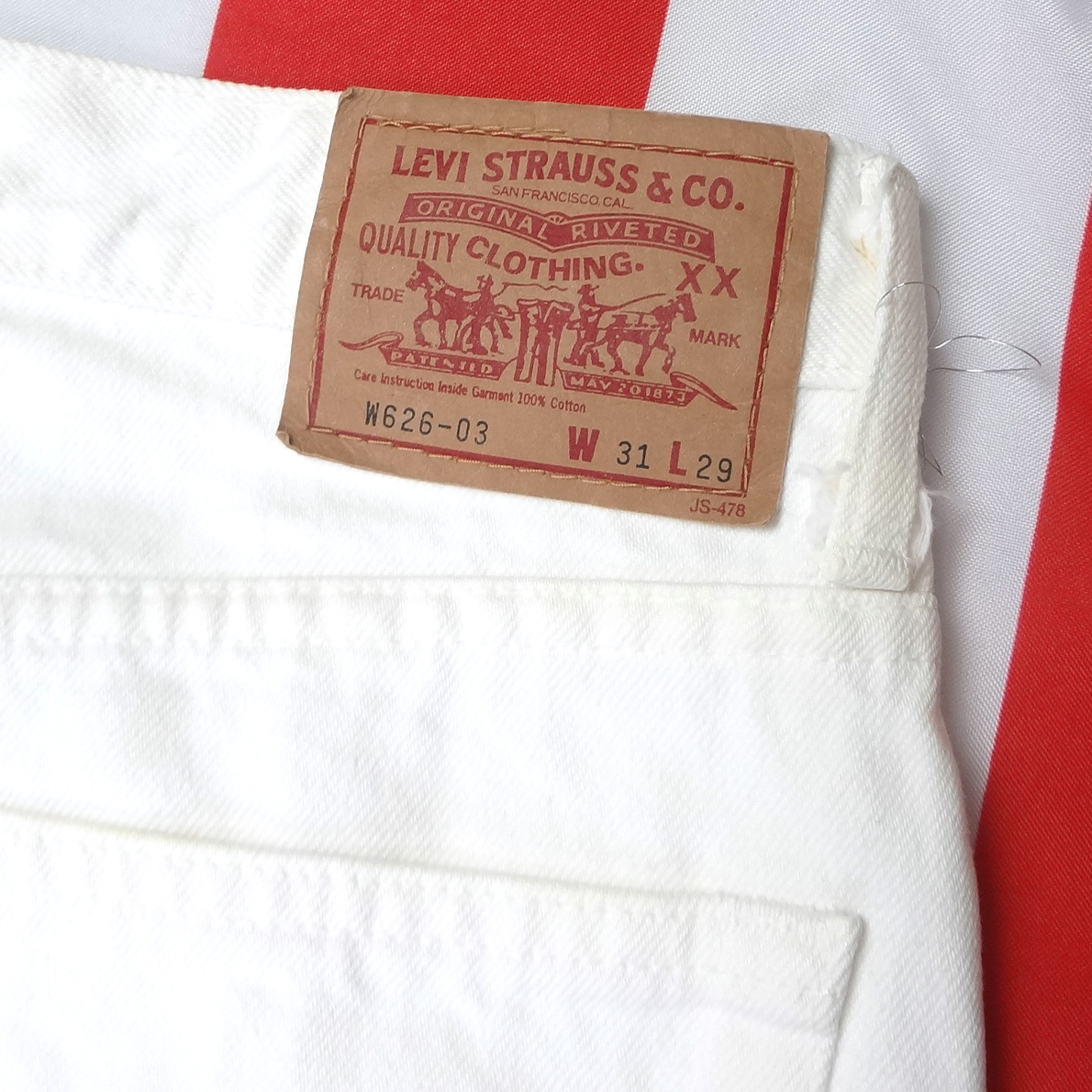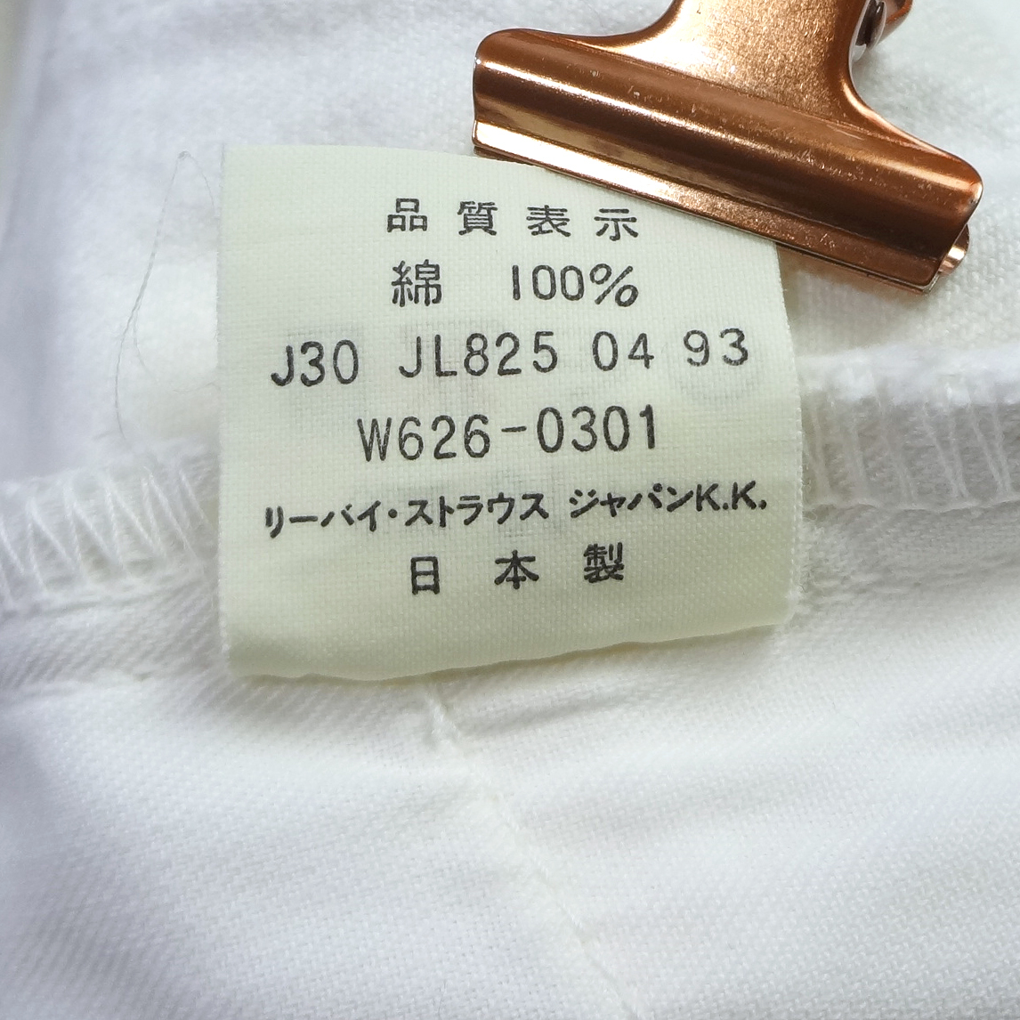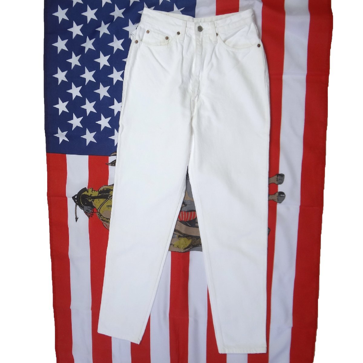 リーバイスのレディース日本製W626スリムジーンズ、実店舗の店頭展示品を1度洗濯しただけの未使用品、綿100%、1993年4月製造、ホワイトリーバイスハイウェスト