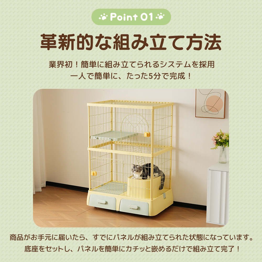 ◆01一台で三役!猫ちゃんも飼い主さんも大満足 ケージ、トイレ、そして収納箱が一体化した 革新的な猫ルーム砂かけし放題 ストレス解放モデル登場 ドームタイプのトイレ 引き出し収納 キャスター付き ワイドなステップ台 猫砂スコップ ロック付き 2段 組み立て簡単 段差更可能 ◆02革新的な組み立て方法 業界初!簡単に組み立てられるシステムを採用 一人で簡単に、たった5分で完成!" 商品がお手元に届いたら、すでにパネルが組み立てられた状態になっています。 底座をセットし、パネルを簡単にカチッと嵌めるだけで組み立て完了! 従来品の課題: 組み立てに必要なパーツが多く、部品の紛失や破損が心配 取り付けや分解に時間がかかる 新商品の解決策: 組み立て済みのパネルを採用し、組み立てが簡単 ジョイント部品を排除し、強度と耐久性が向上 分解もスムーズで、メンテナンスが簡単 ◆03猫ちゃんに最適なトイレ付きゲージ 台座の右側にはドーム型トイレを装備 猫ちゃんは本能的に排泄物を砂で隠しますが、その際に砂が飛び散り、掃除が大変になることも…。 しかし、このドーム型トイレなら飛び散った砂の掃除から解放されます! ※完全に砂の飛び散りを防ぐことはできません。 トイレのカバー トイレの引き出し トイレのカバーと引き出し式トレイ カバーで覆われたトイレは、猫ちゃんが落ち着いて用を足せるよう配慮されています。 引き出し式なので、簡単に取り外して掃除ができ、常に清潔な状態を保つことができます。プラスチック製で水洗いも可能です。 カバーの扉 180度まで開閉可能な扉は、猫ちゃんの出入りや掃除の際に便利。取り外しも簡単で、メンテナンス性に優れています。 ※扉が完全に密着しない場合がありますが、不良品ではございません。 ◆04多機能収納スペース 左側の引き出し式収納箱には、トイレグッズだけでなく、お掃除用具や替え砂、おもちゃなどを収納できます。 幅33cm×奥行45cmの広々としたサイズで、必要なものが一か所にスッキリとまとまります。 \使い方たくさん!/ お掃除グッズ おもちゃ 替え砂 小物 ◆05広く設計された棚板は、猫ちゃんが自由にくつろげる空間を提供します。 十分なスペースがあるので、猫ベッドを置いたり、寒い季節にはマットを敷いて温かい環境を作ることができます。 ※製造工程の都合により、棚板の中央部分に白い点が見られる場合がございます。製品の仕様となりますので、あらかじめご了承ください。気になる方には、同色の補修用シールを同梱しておりますので、ご使用いただければ幸いです。 ◆06上下しやすい梯子 猫ちゃんが楽に上下できるよう、登り降りしやすい梯子を付属。日常的な運動をサポートし、健康を維持するための環境を提供します。多層構造で、猫ちゃんが自然に運動できる空間を確保。 ◆07各段にワイドな扉付き 扉はワイドになっていることから、猫の出し入れに簡単! ◆08片手で脱走防止の安心設計 サイドに設置された大きな扉は、猫ちゃんの出入りや道具の取り扱いに便利です。スライドロック式のため、片手で簡単に操作でき、猫ちゃんの脱走をしっかり防ぎます。これにより、飼い主さんが安心してご利用いただけます。 01 横に引き 02 開ける ◆09キャスター付きで移動も簡単 キャスター付きの設計で、ケージの移動がとても簡単です。お掃除や模様替えの際にも手軽に移動でき、作業がスムーズに行えます。 キャスターにはストッパーが付いており、しっかりと固定できるため、猫ちゃんがケージ内で動き回っても安心してお使いいただけます。 ◆10細部までのこだわり 猫ちゃんの安全性を徹底しています。フェンス間隔は約4.0CMと狭く、すり抜けを防ぐ設計です。