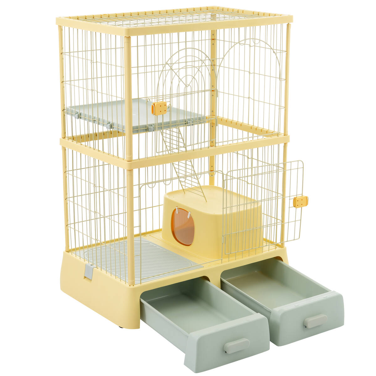 猫 掃除しやすいトレーケージ キャットケージ 2段 多頭飼い 引き出しトレー 組み立て簡単 猫ドア キャットハウス 【クリームイエロー】 收藏