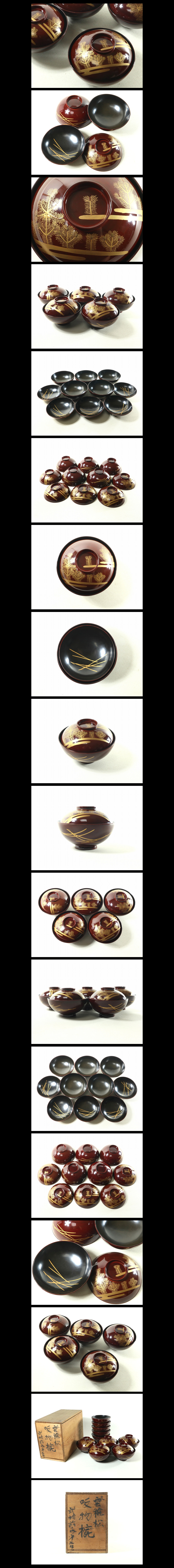 紅春慶のような美しく透明感のある紅溜の塗に内側は黒地、蓋表面には雲稚松、椀側面に松葉、蓋見返り黒地にも松葉の