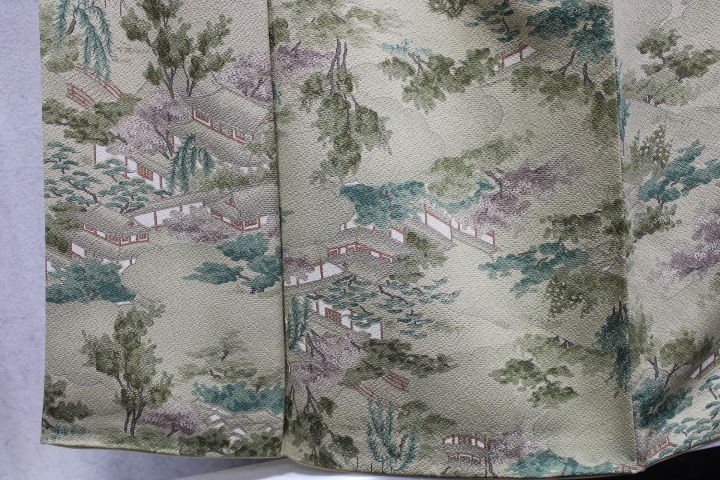 きもの今昔9036 小紋のきもの 広衿袷手縫い仕立 正絹一越地ベージュ色地時代絵模様 御母屋風景に樹木柄 身丈155cm 收藏