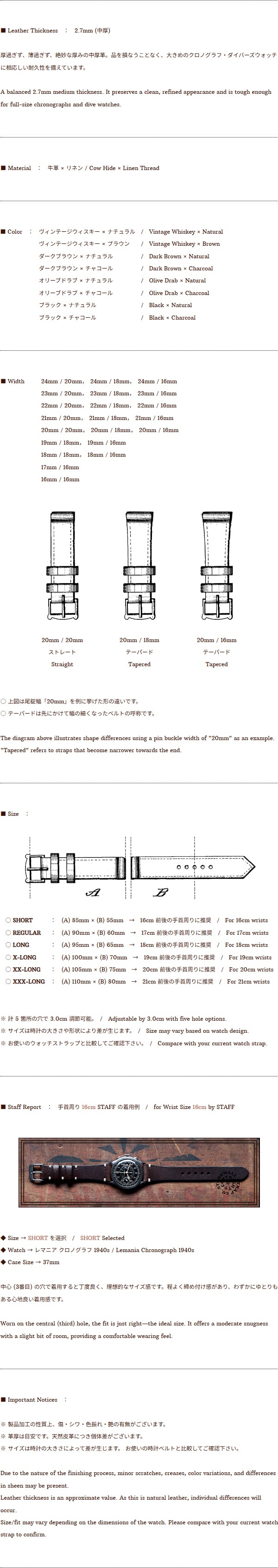 * こちらの商品はフルサイズをストックしておりますので 3日以内 に発送致します。 * 商品は1本の価格です。落札後にご希望のカラー・サイズ・ベルト幅をご連絡ください。 ストーンウォール初の製品加工を施したヴィンテージシリーズです。 1930年代に大量生産されたハンドメイドウォッチストラップを解析。耐久性は確保しつつ、古き良き手仕事の"拙(つたな)さ"をあえて再現することで、ヴィンテージの雰囲気をより高めています。 特筆すべきは、あえて拙く粗雑なつくりにすることで生産時間を短縮、さらには革本来のシワや傷が入った部位を製品の魅力として活かすことで、大幅なコストダウンが実現した点です。 ストーンウォールの耐久性と、素材はそのままに、ヴィンテージの魅力を最大限に引き出した、コストパフォーマンスにも優れたウォッチストラップです。 傷・シワ・汚れ・濃淡・刻印のずれ・大雑把な縫い等、その全てが演出であり、同商品最大の魅力であることを予めご留意願います。 やや厚みのある中厚革を使用した *ライトヘビー モデル。 大きめのクロノグラフ、ダイバーズウォッチには最適のウォッチストラップです。 尾錠にはやや重量のあるベーシックな角形を採用。 古い時計、現行時計を問わず好相性です。 形は第二次世界大戦時にアメリカ軍で採用されていたウォッチストラップをベースに、 貼り合わせのない一枚革を総手縫いで仕立てています。 同モデルでは *ウィップステッチ を採用。 先史時代に起源を持ち、様々な文化圏で何千年も使われてきた、最も原始的で洗練された縫製技術です。 革はイタリア・トスカーナ産のバケッタレザー *アールヴ 。 同革は最上質とされるフランス産の原皮を植物性タンニン100%で充分に時間をかけて鞣し、加脂されます。 これにより耐久性に優れていながらも、柔かく、しなやか。 手首に吸い付くかのような着け心地は、時計を着ける喜びすら与えてくれます。 極自然的な製法で鞣した同革は、最も経年変化を愉しめる革としても絶大な支持を得ています。 ● ヴィンテージ加工素材の性質上、傷・シワ・色振れ・艶の有無がございます。 ● 革厚は目安です。天然皮革につき個体差がございます。 ● サイズは時計の大きさによって差が生じます。 お使いの時計ベルトと比較してご確認下さい。 ● 決済日より起算して5日後以降から配達日時指定が可能です。 ● 説明文に記載の無い点につきましては、落札前に必ずお問い合わせの上ご確認下さい。 |