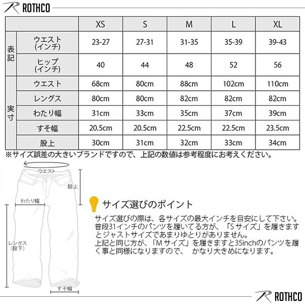 | USミリタリーブランドの老舗ROTHCO社の6ポケットカーゴパンツです。普通のチノパンと同じくらいの厚さのツイル生地(チノ生地)のボディで、ヒップと膝にパッチが付いたオーソドックスなカーゴです。レングスはドローコードを絞ってスソをたるませることによって、多少調整して履くこともできます。フロントはボタンフライ(ボタン開閉)です。シルエットはチノパンに近い感じになり、履き心地も良くお勧めの商品です。リーズナブルなプライスですので、リメイクやチームユニなどにもお勧めの1本です。他のカラー、サイズも出品中です。 MADE IN CHINA ■ブランド: ROTHCO ■商品名: ULTRA FORCE B.D.U.'S PORY/COTTON TWILL ■カラー: タイガーストライプ ■素材: ポリコットン混紡のツイル地 ■サイズ表(cm): 《Mサイズ》 表記サイズ:ウエスト31-35インチ、ヒップ48インチ 実寸サイズ:ウエスト88,レングス82,わたり幅35,すそ幅22.5,股上32 ※サイズ誤差の大きいブランドですので、上記の数値は参考程度にお考えください。 ■仕入元: ROTHCO(正規店) ■状態: 新品未使用(タグ付き) |