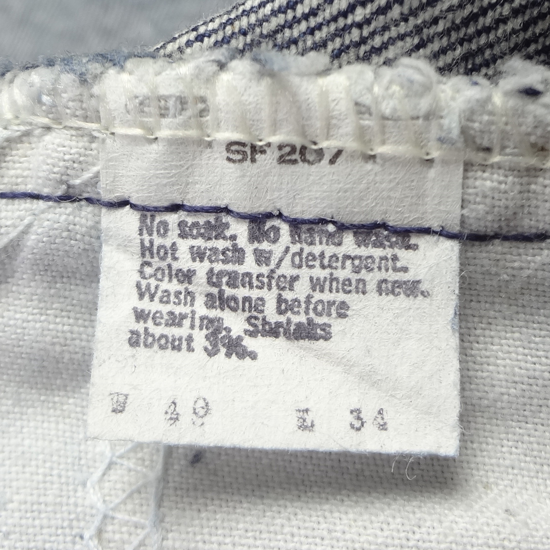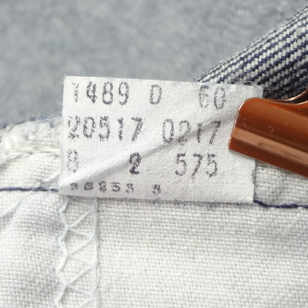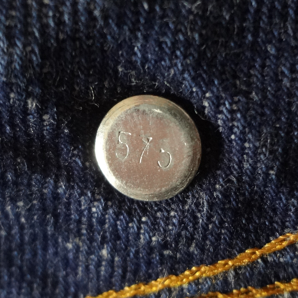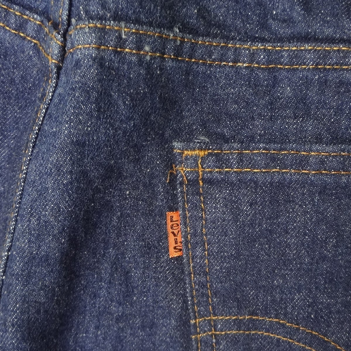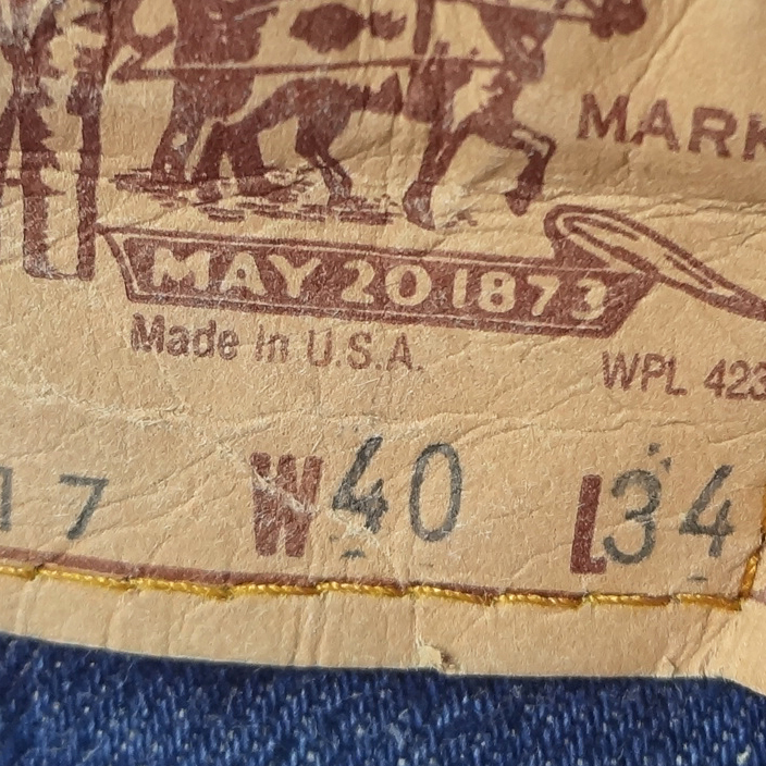 ・スモールeオレンジタブ、アーキュエットステッチ、ジッパーフライ、5ポケットリベット、MADE IN USA表記入りペーパーパッチ