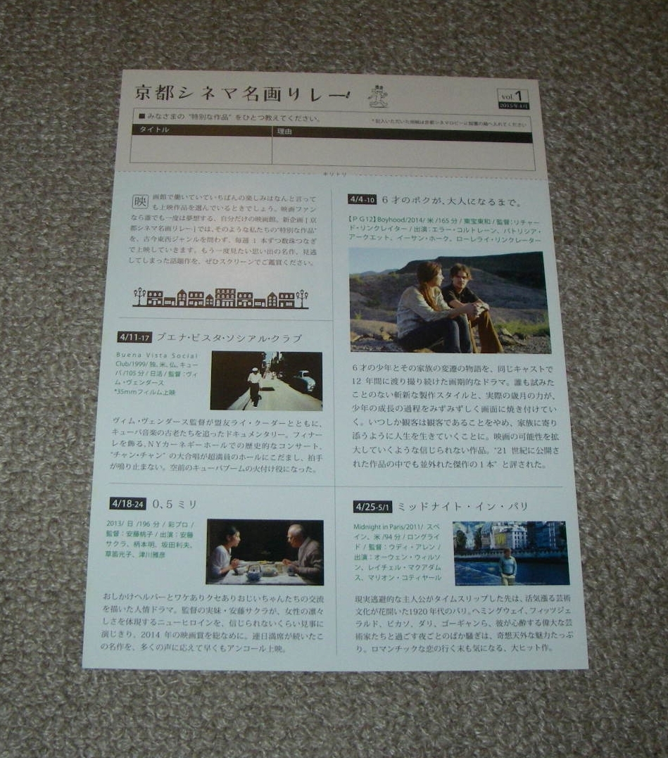 映画「6才のボクが大人になるまで。」の京都シネマ版チラシ。 サイズ:B5 出演:エラー・コルトレーン 折れ・汚れなしの美品です。品物は美品ですが細かいキズ等気にされる方はご遠慮ください。ノークレーム、ノーリターンでお願いいたします。また、入札後の取り消しは一切お受けいたしません。よろしくお願いいたします。