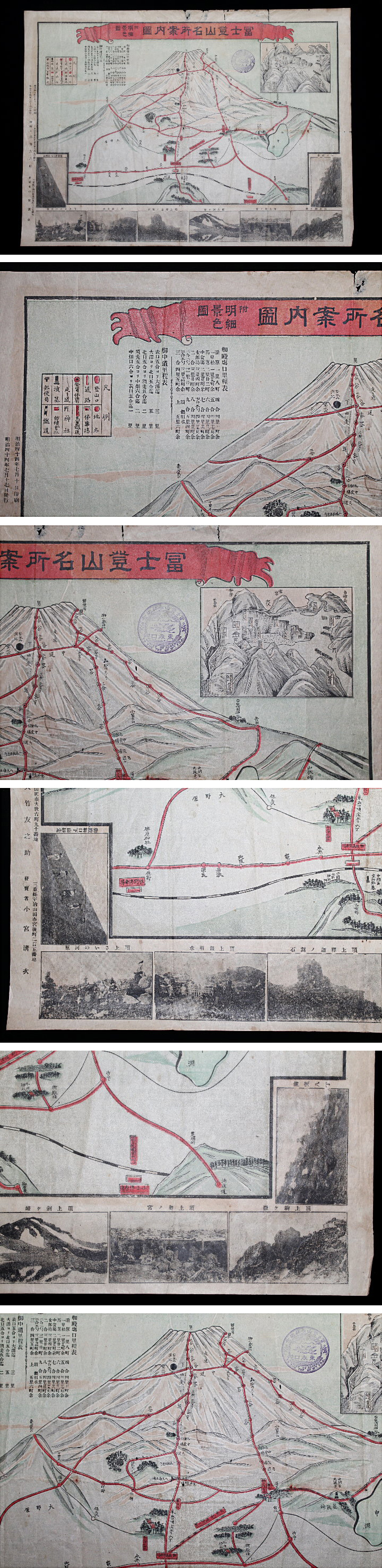 サイズ:54.0×39.9cm 「冨士登山名所案内図 附/明細景色図」です。 左側 明治44年7月10日印刷 明治44年7月17日発行 発行人:大竹友之助 発売者:小宮清次 右上印 冨士登山参拝記念 東表口 IN MEMORY OF ASCENDING TO THE TOP OF Mt.FUJI. 汚れ・ヤケ・折痕などの傷みがあります。 写真をご覧の上ご入札宜しくお願い致します。 ※ 紙筒に入れ発送。 | |