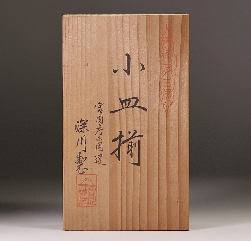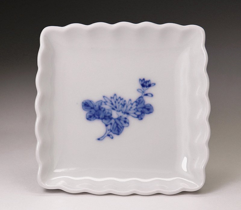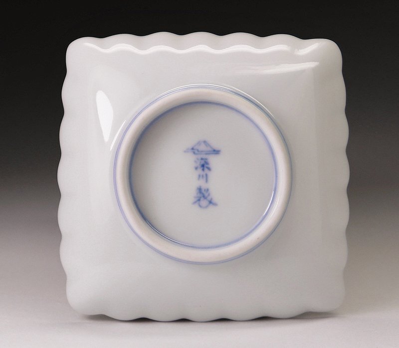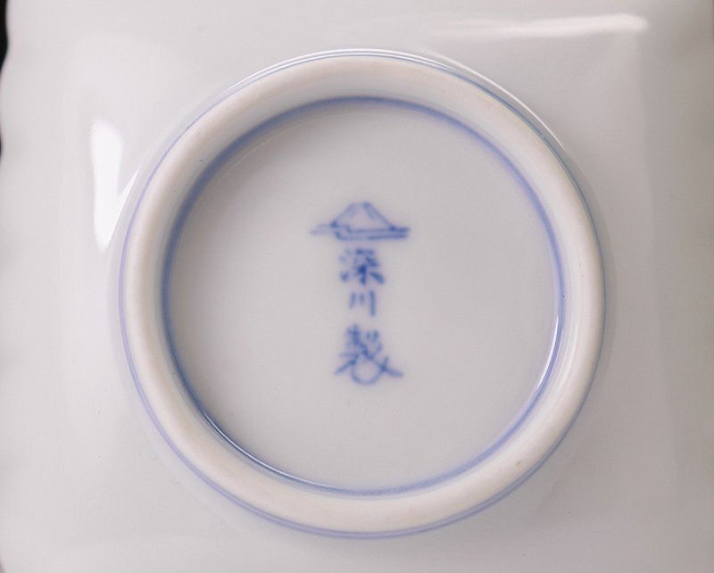 ∇花∇宮内庁御用達【深川製磁】作 染付菊文波縁四方小皿揃 五 共箱付 懐石道具 收藏