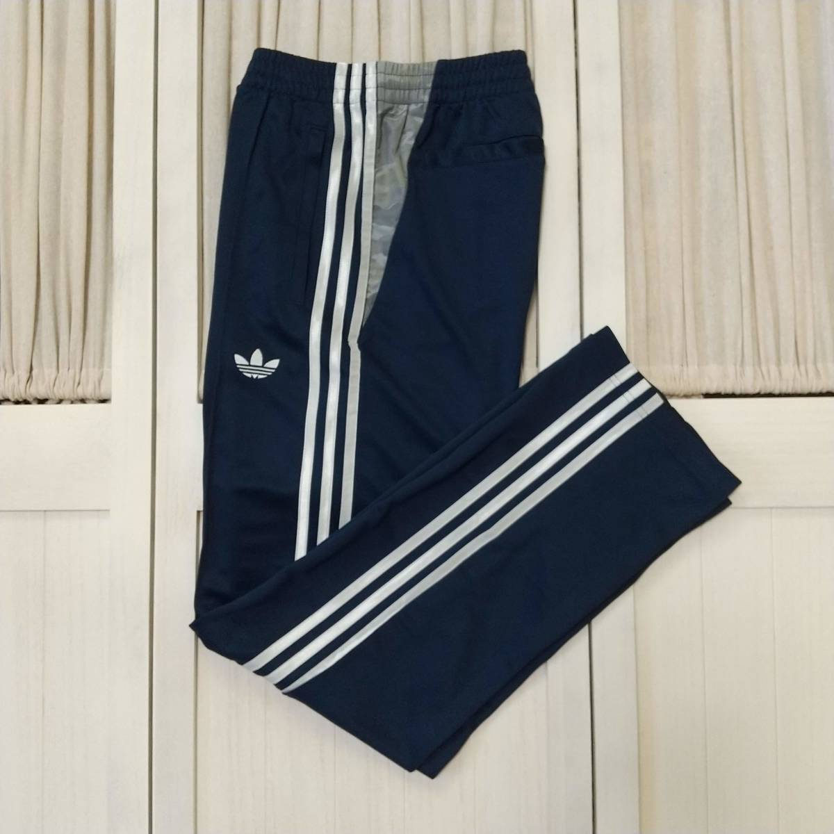 ネイビーカラーにライトシルバーのスリーストライプとトレフォイルロゴが施され、襟裏や脇下や両腰にアクセントとしてライトカモフラージュ柄を絶妙なバランスで随所に配しています。