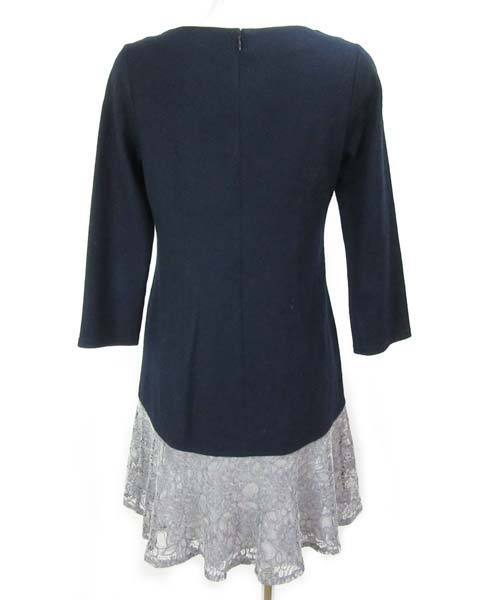 | 紺とグレーレースの上品なワンピース。女性らしい雰囲気がクイーンズコートらしい。きちんと感があり、ビジネスシーンやお出かけスタイルなどいかがでしょうか。 |