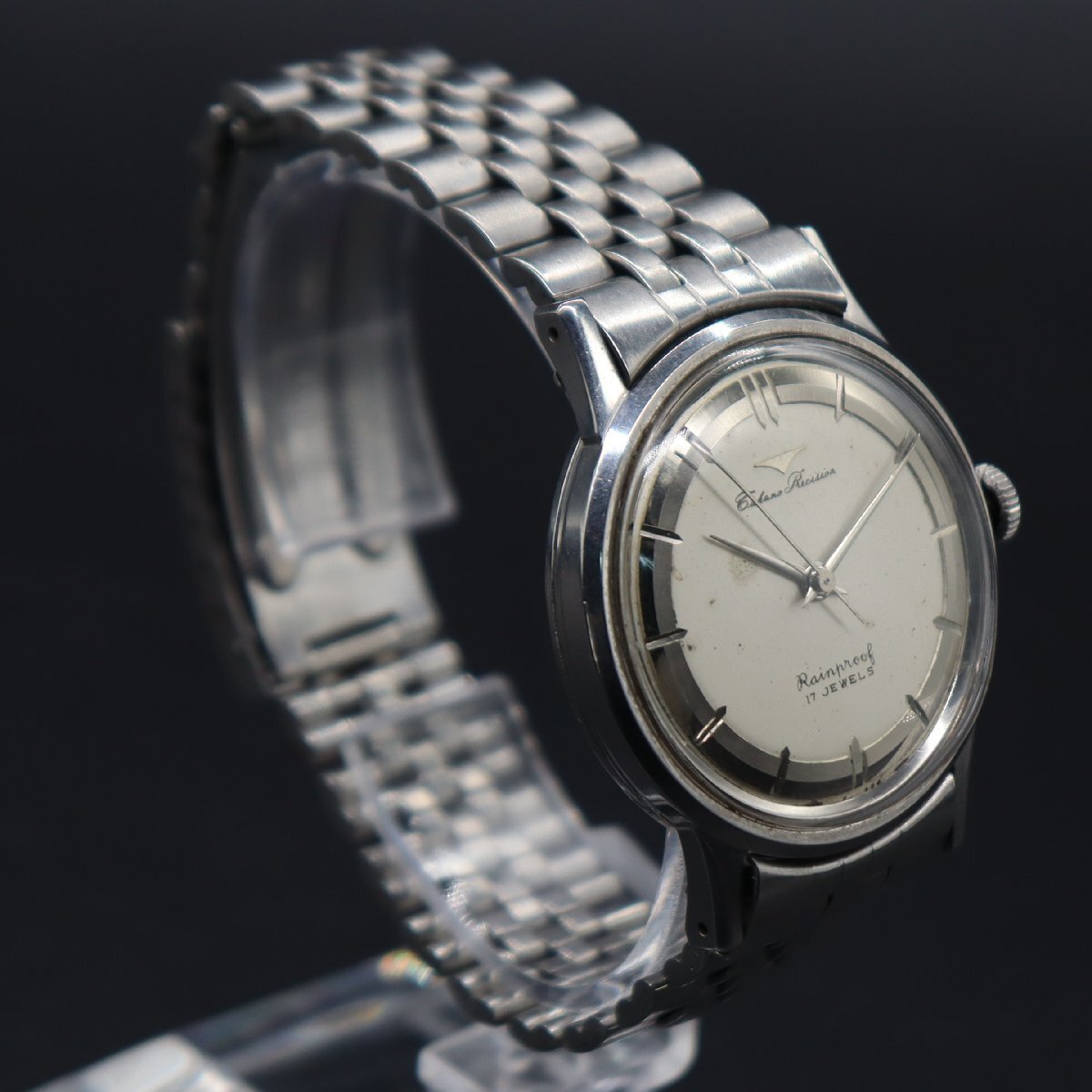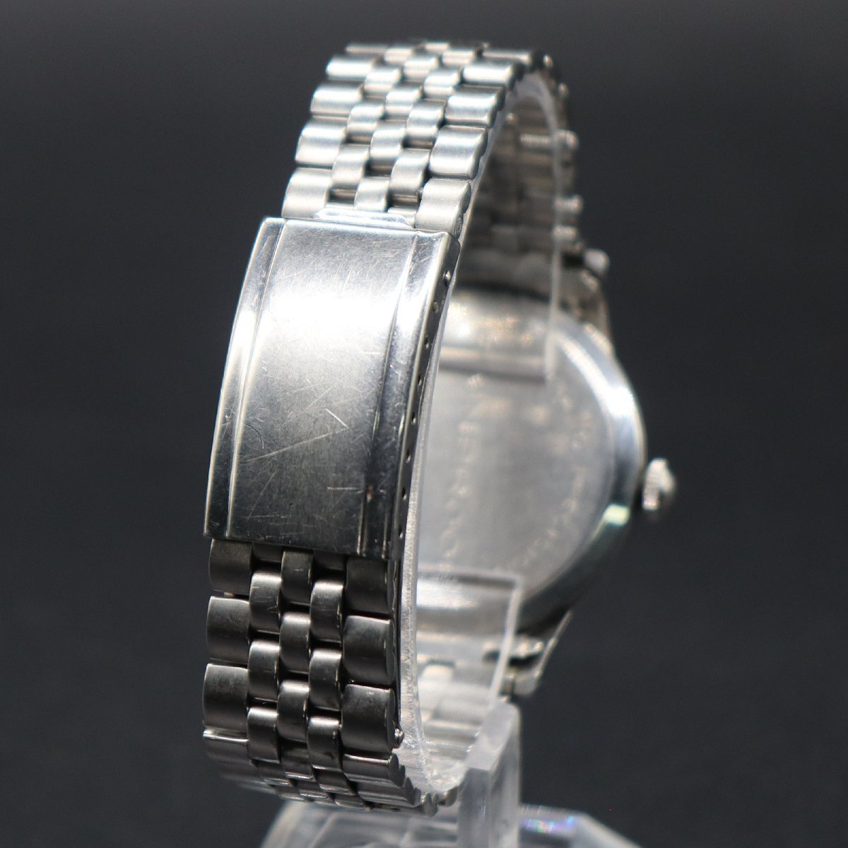 令和7年10月、当店専属の時計修理店(一級時計修理技能士)にてOH済みです。 OH後、平置きで24時間動作確認済み、+30秒以内で稼働中です。 この機会にぜひ、お手元にてご愛用ください。 リューズ巻止まりOK、一段引きで時間調整可能です。 リューズの引き出しが軽くなっております。 ※アンティーク時計を長くお使いいただくため、 丁寧に、やさしく操作していただくようお願いいたします。 全体に経年使用による小キズ・スレ・小汚れ、 文字盤とフチに汚れや傷みございますが、 風防は目視で目立つキズはなく、視認性は良好です。 針・インデックスは小傷みある程度で、 筆記体ロゴ・印字にかすれ消えはございません。 リューズ、ロゴマーク付きです。 裏蓋刻印、鮮明です。 ブレスは小汚れ・スレ・タレがあり使用感はございますが、 バックルの開閉良好で、通常使用に問題ございません。 状態について、詳しくは画像にてご判断願います。 | |