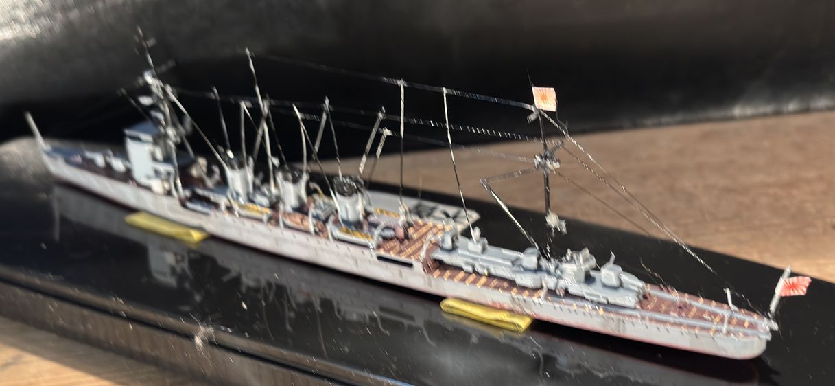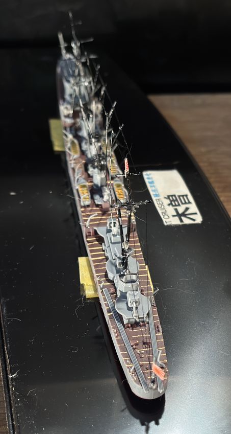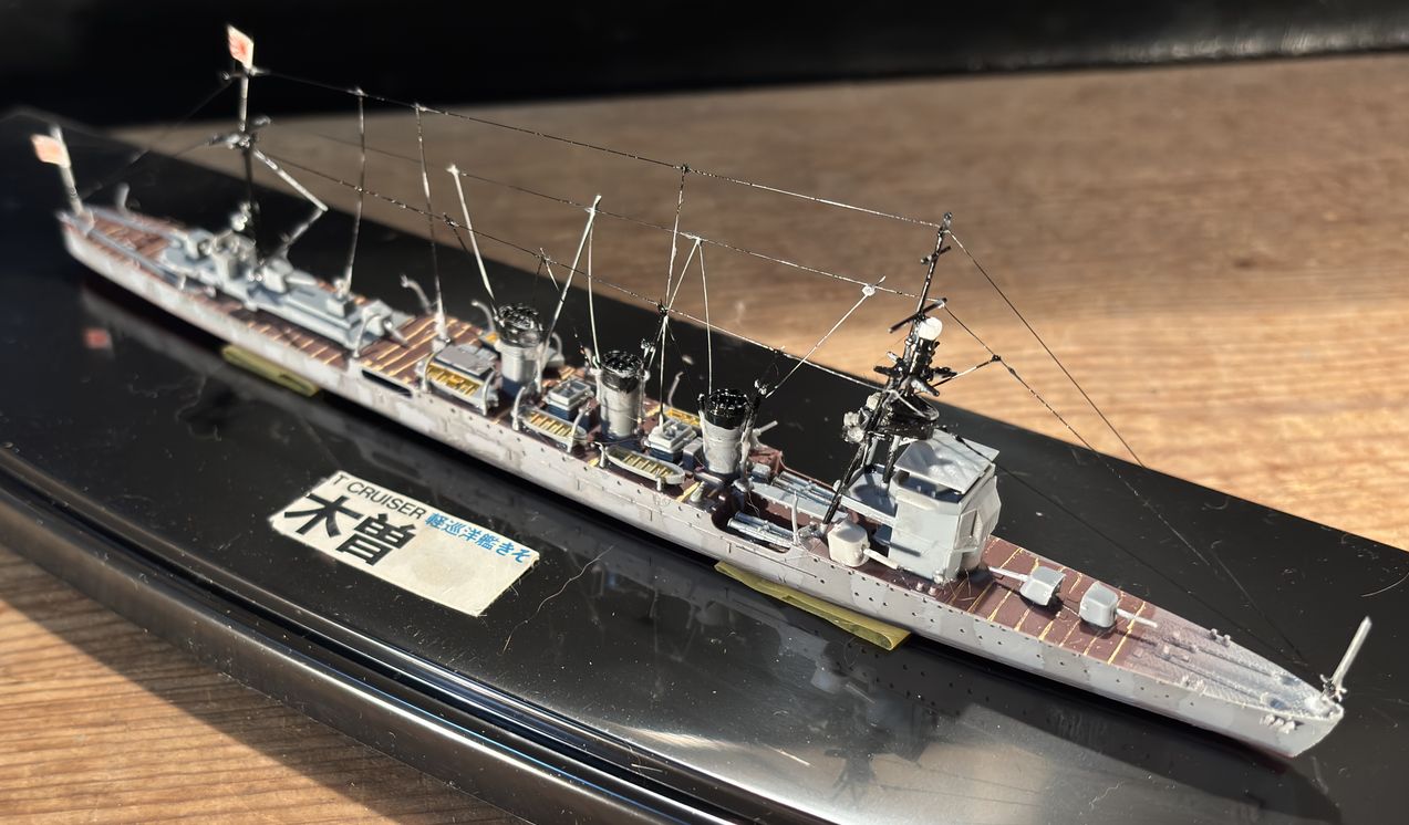 球磨型巡洋艦の6番艦、木曽は大正11年の(1921年)に長崎佐世保造船で作られています。主にアッツ島、キスカ島などの北方任務に従事、しかしミッドウェーでの戦況変化に伴い南方の輸送船団警護に任務が移行していきます。昭和19年のレイテ戦闘に巻き込まれますが生還、時雨を編入し内地へ帰島しますが、そのあとマニラ停泊中に昭和19年11月13日米機動部隊の爆撃をうけマニラ湾にて大破着底、そのまま終戦を迎えています。