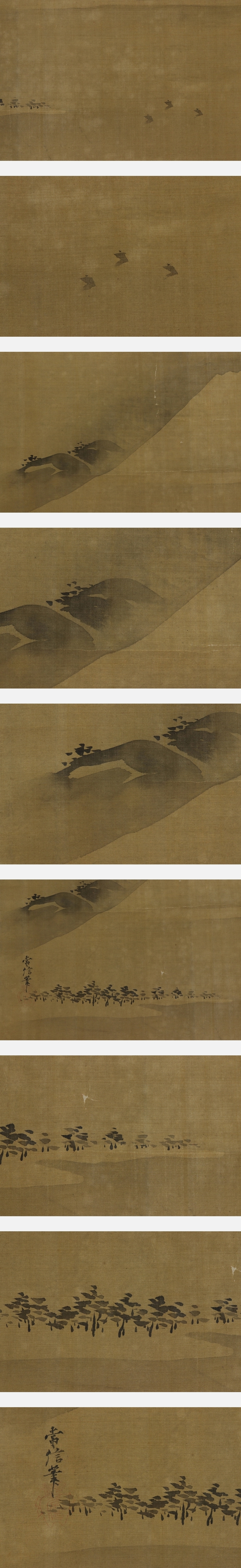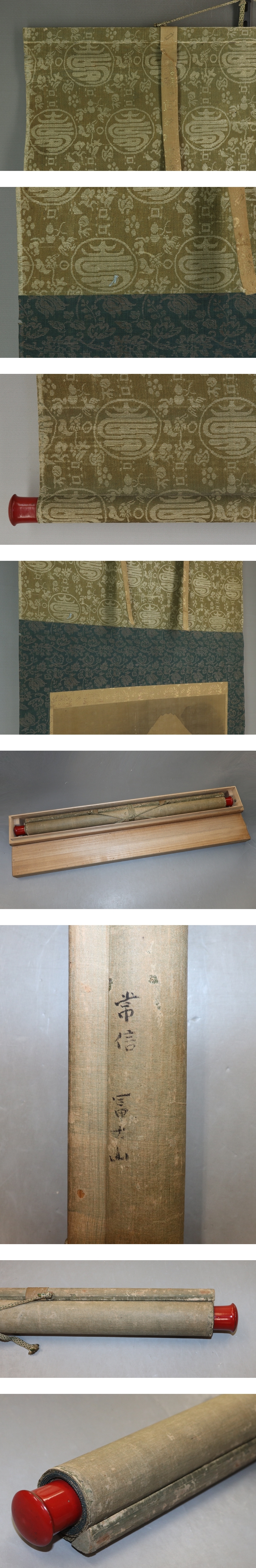 狩野常信 かのう-つねのぶ(1636-1713) 江戸時代前期-中期の画家。 寛永13年3月13日生まれ。狩野尚信の長男。慶安3年(1650)父の跡を継ぐ。 御所障壁画制作に参加し,宝永年間には狩野派の最高指導者として紫宸殿の「賢聖障子」を描く。 宝永6年法印。木挽町狩野家隆盛の基礎を固めた。正徳3年1月27日死去。78歳。 京都出身。通称は右近。号は養朴,古川叟。 本紙は、染み、汚れ、折れ、皺、破れ、強いヤケがあります。 表装は、染み、汚れ、折れ、皺、虫食い、破れ、ほつれ、軸先に汚れと擦れがあります。 【サイズ】 作品 横約46.5cm×縦約32cm 表装 横約59.5cm×縦約126cm |