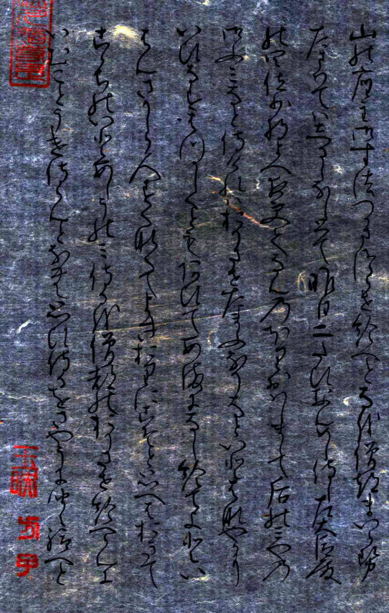 自筆の稀少価値は、和紙の生成技法の緻密さにあります。上の「拡大断層(MRI)写真」でわかる通り、極めて薄い和紙の上に墨の文字がくっきりと浮き上がるように「源氏物語」の文字が記されております。 出品している書の「断層(MRI)写真」の原板は、レントゲン写真と同じ新聞の半分ほどの大きさのフィルムです。肉眼では見ることのできない和紙の繊維の一本一本のミクロの世界を見ることができます。日本国内では医療用以外には見ることのできない書の「断層(MRI)写真」です。 古切の書は、一旦表装を剥離し分析と鑑定検査のために「断層(MRI)写真撮影」をしております。撮影後、展示のために再表装をしております。掛軸や屏風にすることが可能なように、「Removable Paste(再剥離用糊)」を使用しているため、自筆の書に影響をあたえずに、容易に「剥離」することができるような特殊な表装となっております。 |