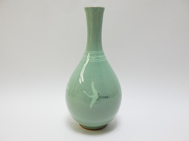 ★ 韓国陶窯 東谷 金正黙 青磁 象嵌 雲鶴文 徳利 合箱 ★H175 Celadon Glazed Porcelain Inlaid With Cloud And Crane Design Sake Bottle 收藏