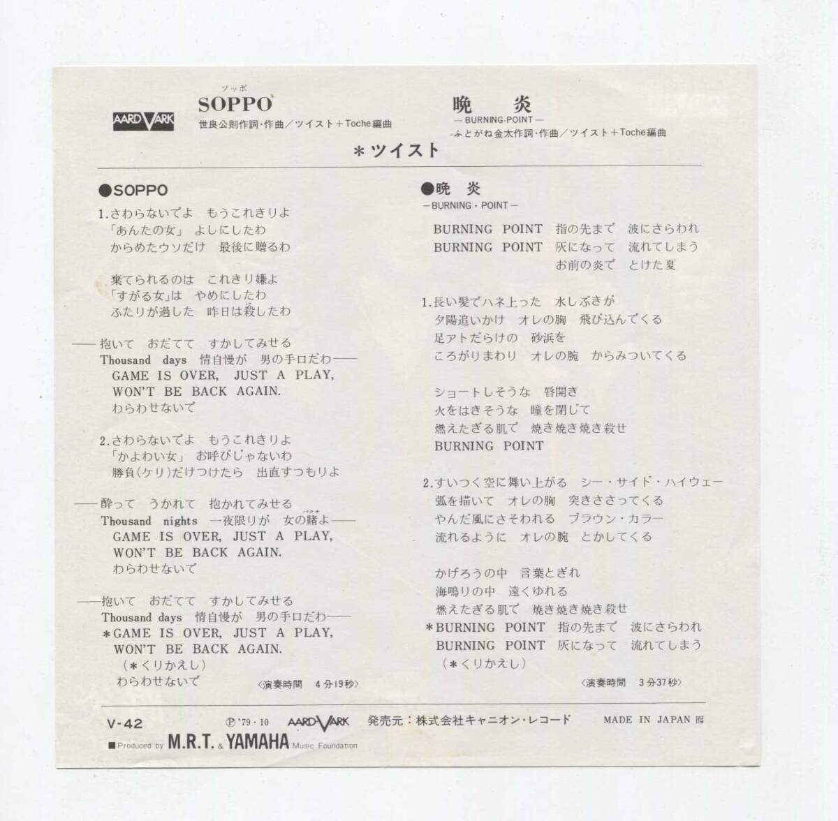 【EP レコード シングル 同梱歓迎】 世良公則 TWIST ツイスト ■ SOPPO ソッポ ■ 晩炎 BURNING POINT ふとがね金太 收藏