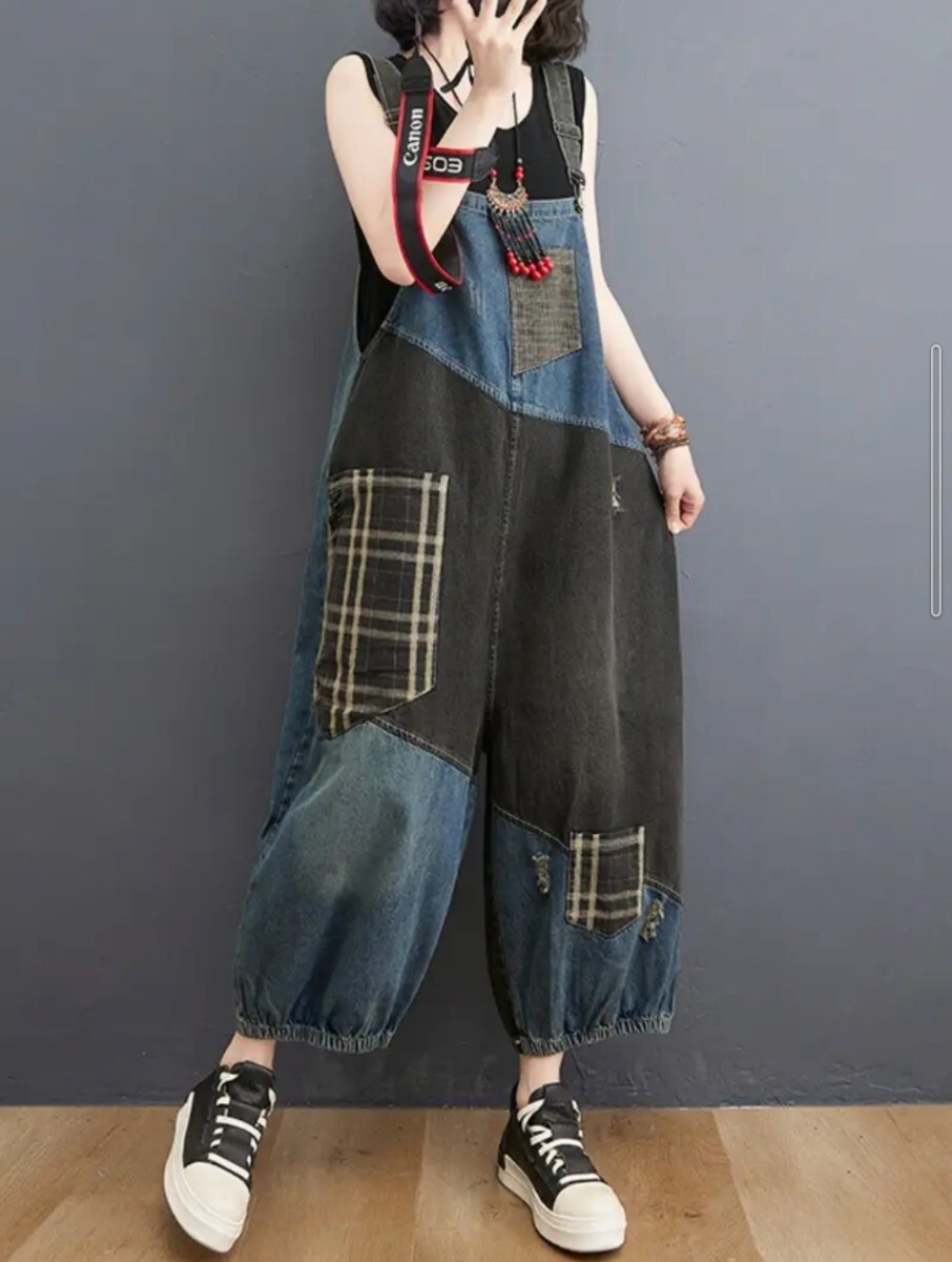 XXL 大きいサイズ デニムオーバーオール サロペット ゆったり チェック パッチ ダメージ 切り替え ワイドパンツ ブルー×ブラック 收藏