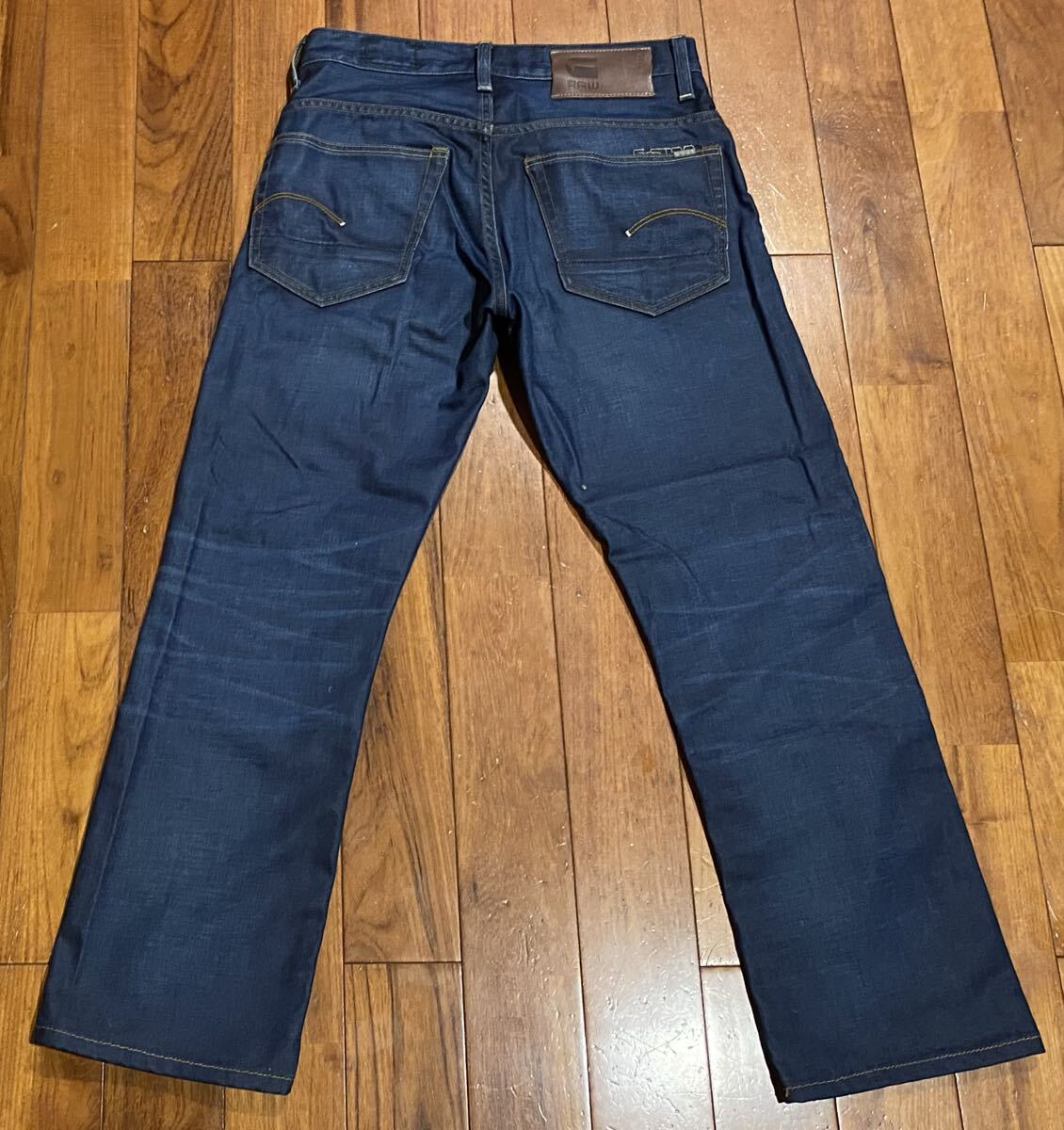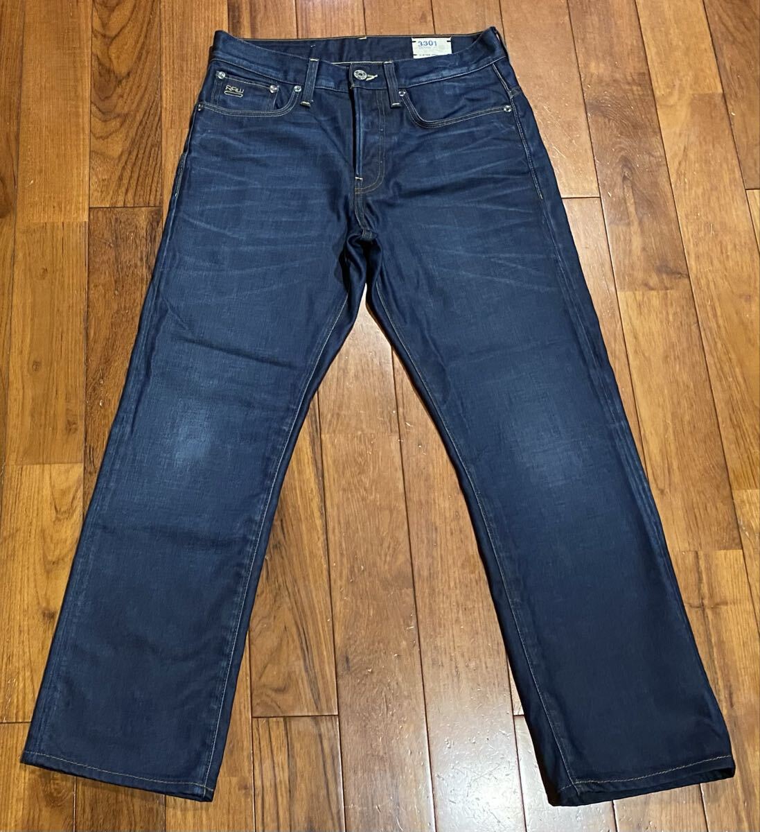 ジースターロウのデニム(ジーンズ)、3301 STRAIGHT 50128.4639.89です。色はインディゴブルーです。USEDでアンクル丈に裾直ししておりますが状態は良いです(10段階中8程度)。牛革パッチ、ボタンフライです。生地は綿100%です。正規品です(ジースターインターナショナル(株)、インド製)。サイズはW29でウエストは重ねずに平置きで約76cm、ヒップ約98cm、股上約26cm、股下約68cm、股下15cmのふともも部分約50cm、裾まわり約40cm、重量約590gです。発送はゆうパケットポストになります。