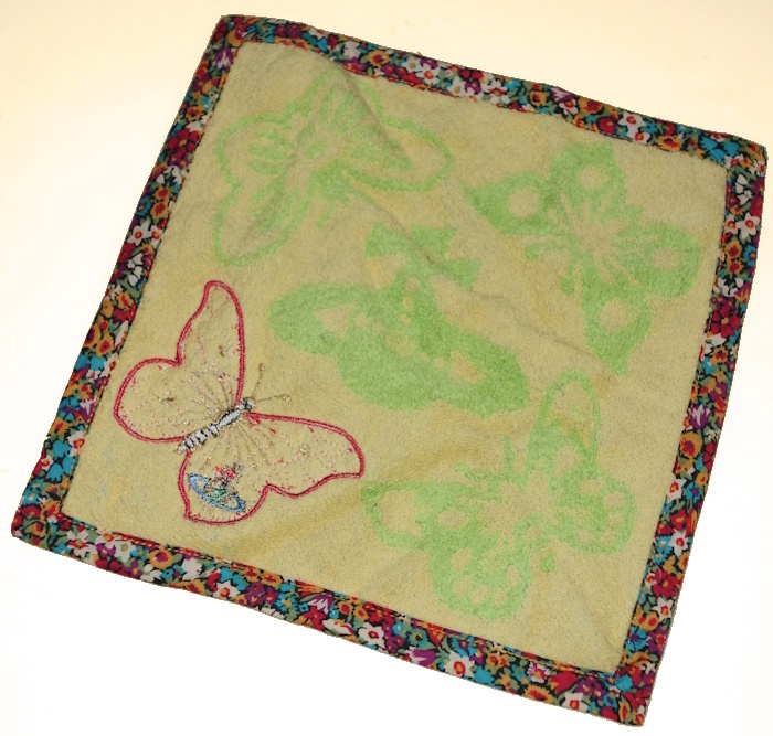 リバティ柄がちょうちょのアップリケと縁取りに使われていてとても可愛いデザインです。