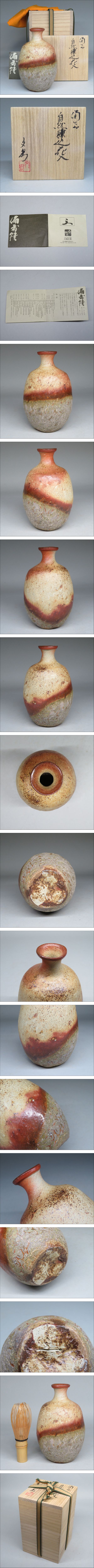 備前焼 名工【川端文男】 備前自然練込花入 徳利 共箱 共布 栞 本物保証 | ||