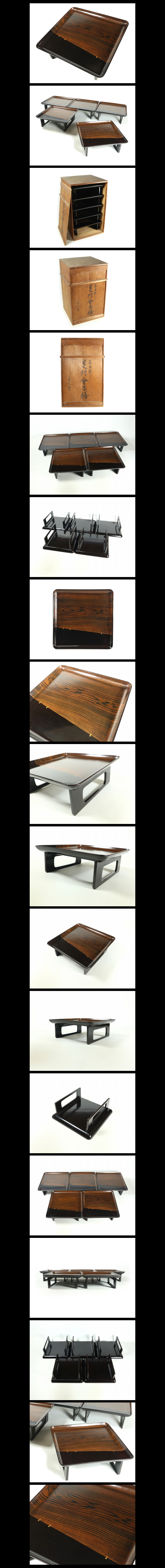 ●c1099●【木目出し足付会席膳[大]5客 塗分木目黒楔くさび部分金蒔絵木製共箱/懐石膳折敷盆】検お茶会煎茶道具茶懐石輪島塗京漆器●西瓜●