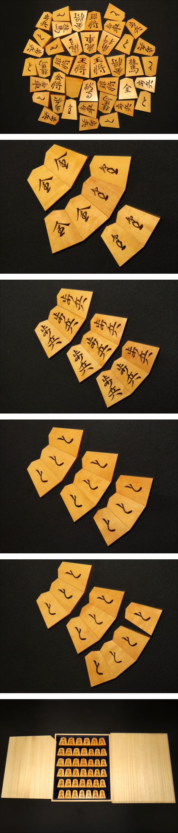木地は御蔵島黄楊斑入絹柾。ご御覧のとおり、味の良い木地です。全ての駒の表裏をUP致しましたので是非ご覧下さいませ。
