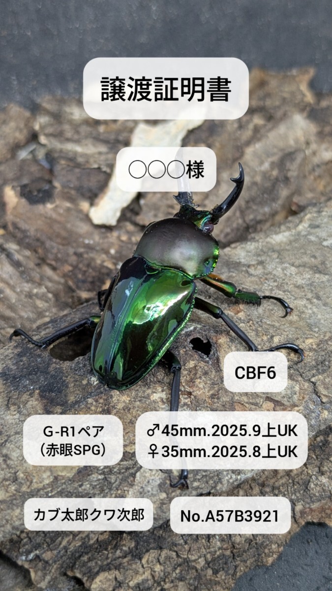 ●赤眼とグリーンカラーを追求して累代を続けてます。マットブラックな前胸に濃いスーパーグリーンはとても魅力的なカラーです。青紋とホワイトアイの血が入ってますので、両方の遺伝子は少なからず有ります。