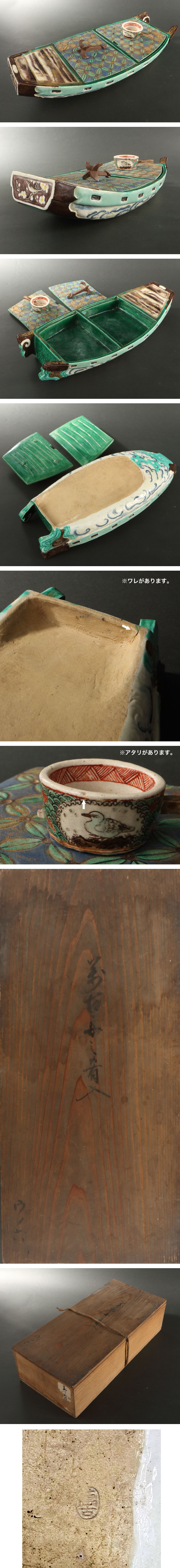 古萬古の酒肴入です。 釣舟を模した酒宴の珍味入れで、蓋には青釉と緑交趾の七宝繋があしらわれ、それぞれ碇(いかり)と柄杓(提子)を象った摘みがついております。 一見古清水に見紛う優美な文様美を呈し、かつ舳先に「鶯宿梅」、柄杓に「都鳥」が絵付されており、和様との融合が感ぜられます。「萬古」の楕円窯印は興廃を繰り返しながら各地で数世代にわたって用いられており、厳密な手分けは難しいものの、以上の細密な意匠からは将軍御用も務め洗練された江戸万古の気品を感じさせます。 舟に柄杓といえば「船幽霊」が連想されますが、本作の柄杓には底が存し、お伊勢参りの旅人が携行した柄杓と見ることができるでしょう。江戸への廻船業で富をなした伊勢商人や神宮への参詣客に沸く宿場の活気、そして遊び心が感ぜられる逸品です。 付属:識箱が付属します。 寸法:高さ17.5cm、幅40cm、奥行17cm(最大幅。若干の誤差はご了承下さい) 状態:経年感、複数アタリ、ワレ(カマキズ)がございます。 |