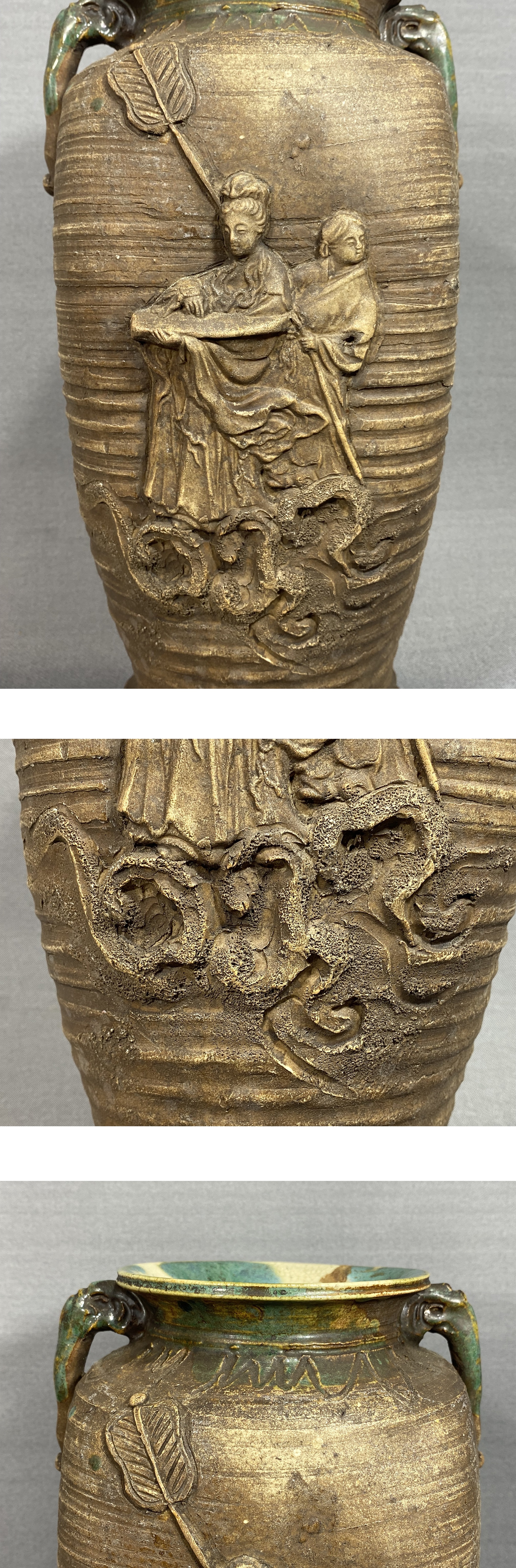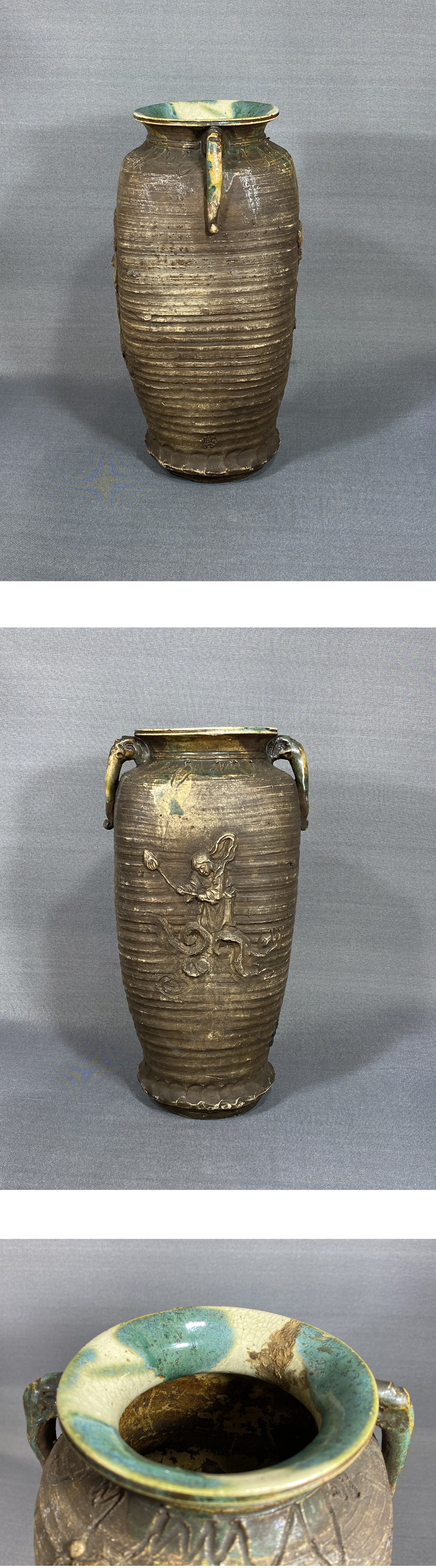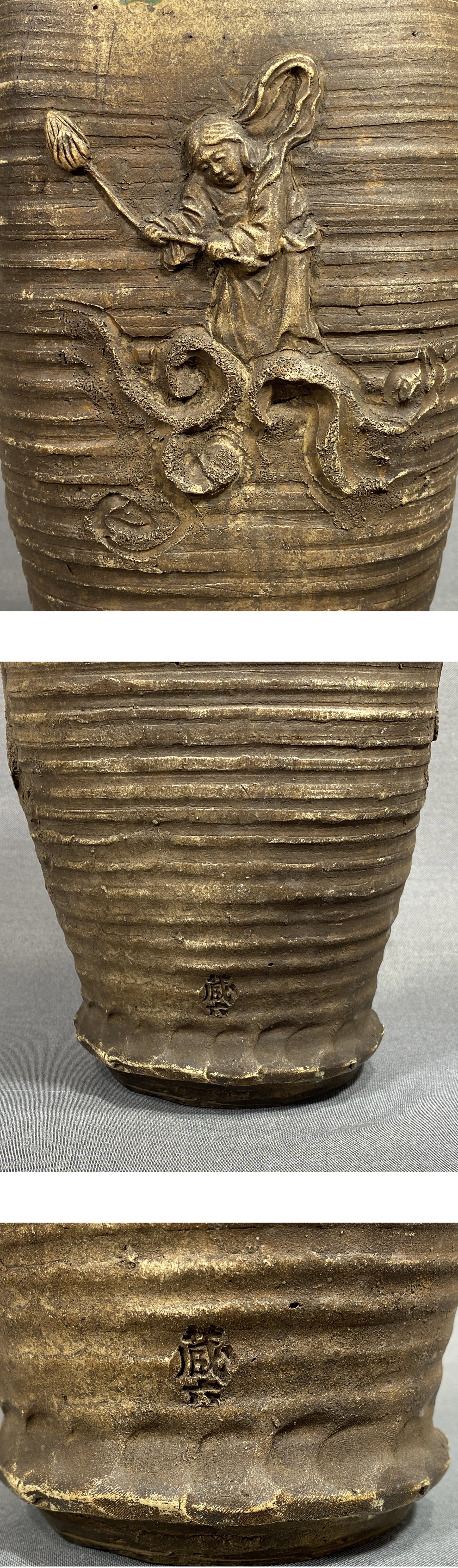 【風車】 初代 真清水蔵六 造 窯変釉 人物彫 耳付 花入 ▲在銘 名工 京都の陶工▲青磁の蔵六 骨董 古美術品 收藏