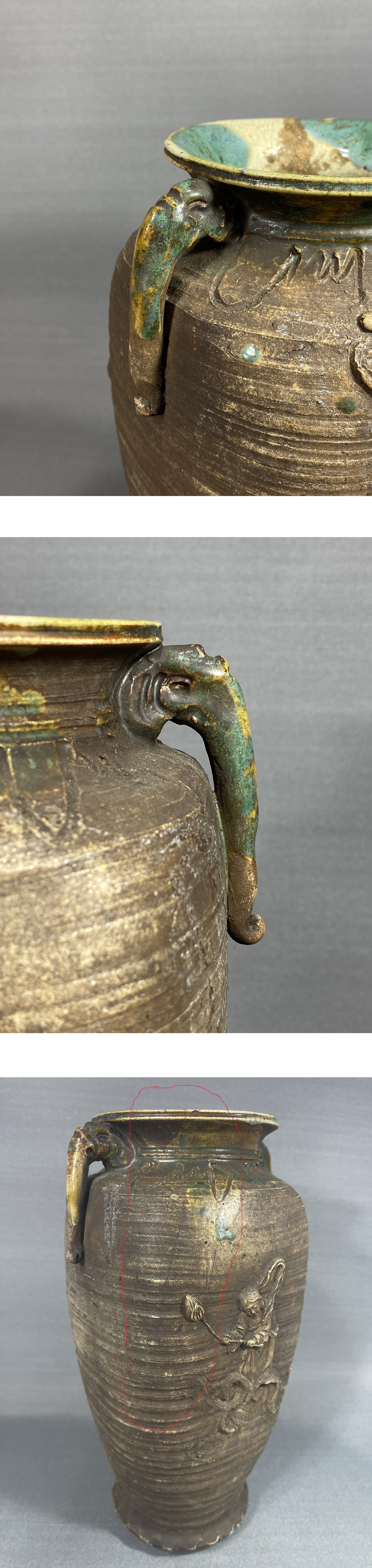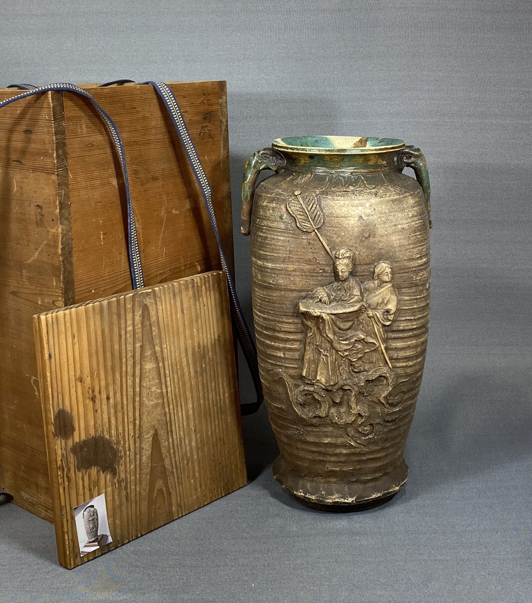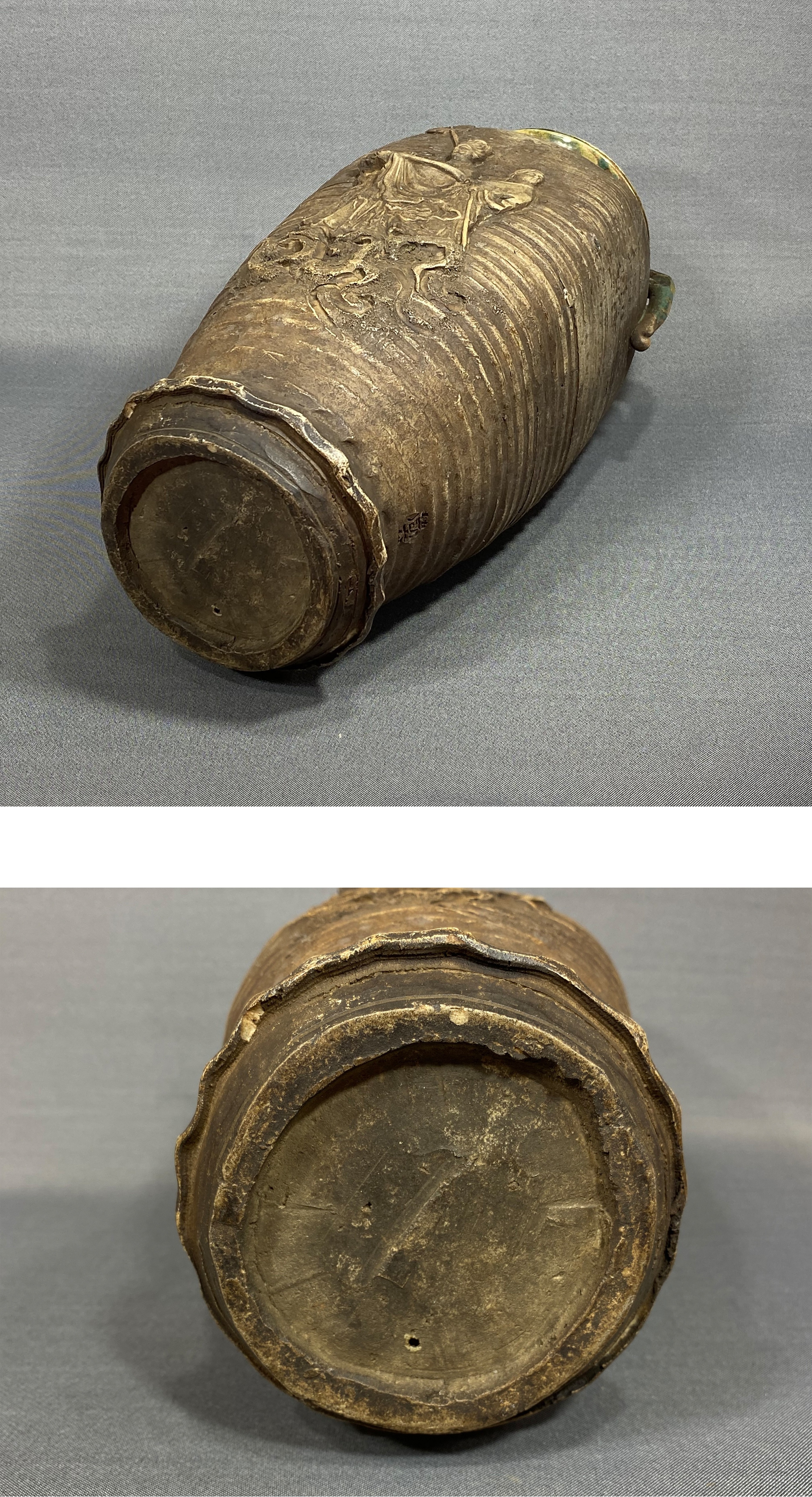 【風車】 初代 真清水蔵六 造 窯変釉 人物彫 耳付 花入 ▲在銘 名工 京都の陶工▲青磁の蔵六 骨董 古美術品 收藏