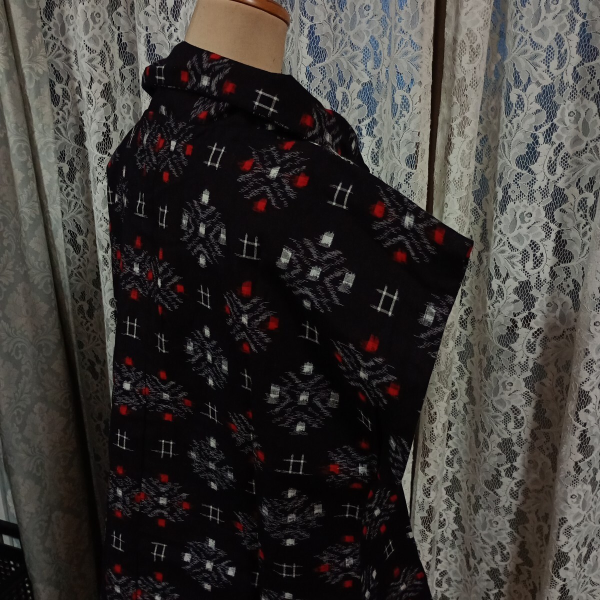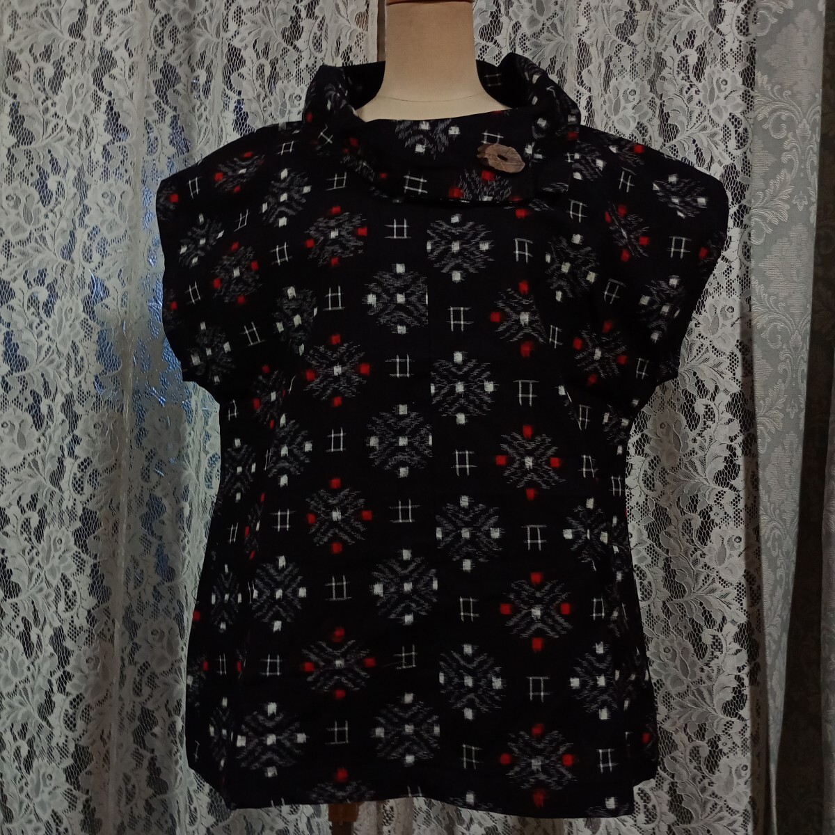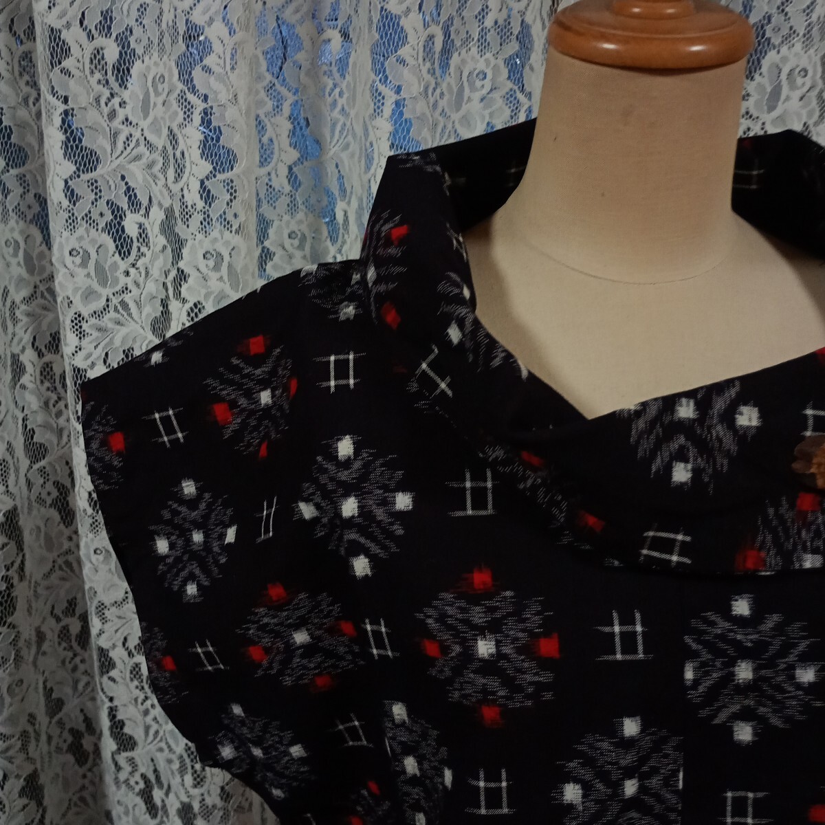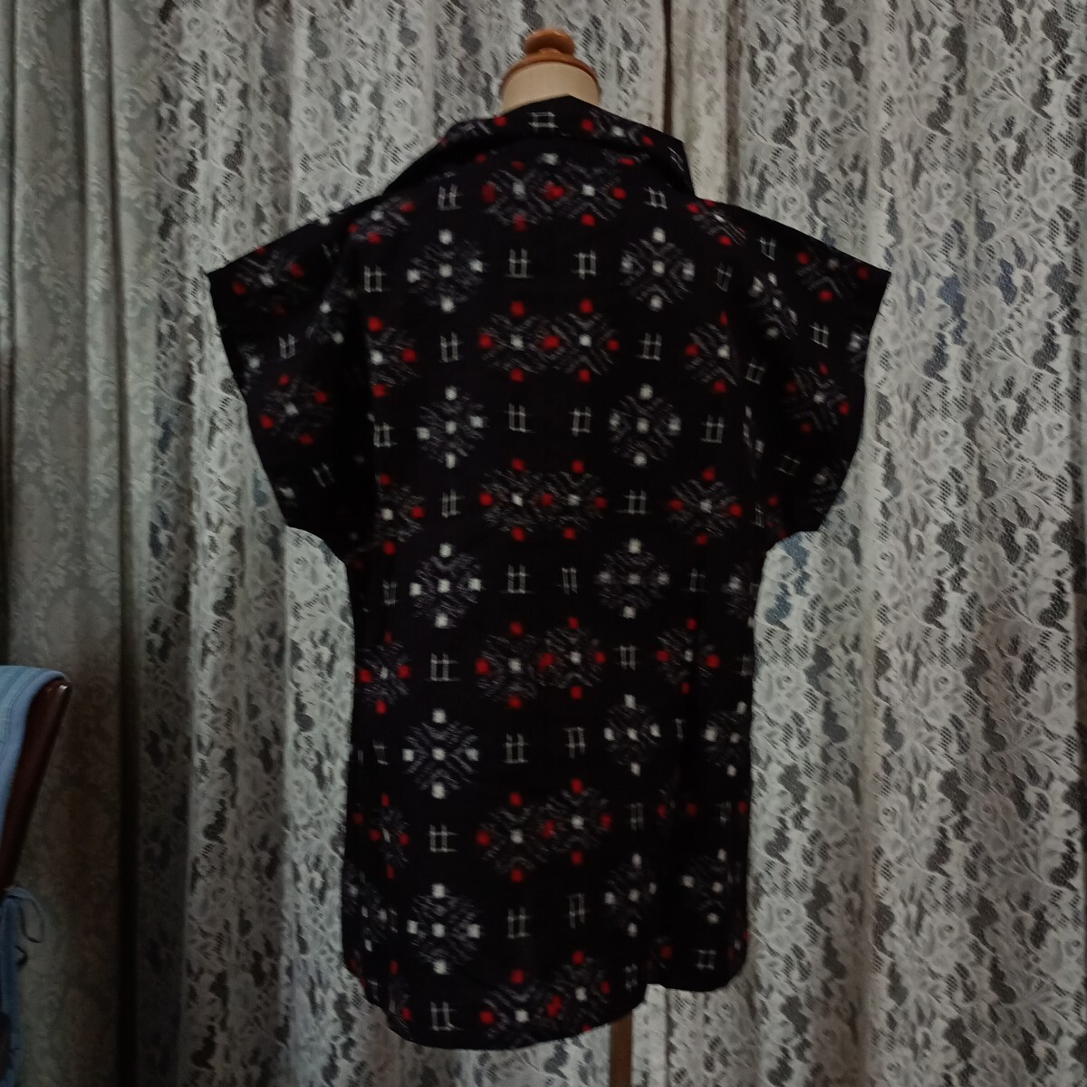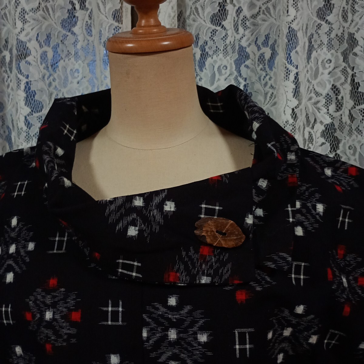古布木綿の久留米絣で製作しました。未着用品です。サイズは着丈65cm、裄丈29cm、フリーサイズで襟の飾りボタンは木製です。久留米絣らしい白が鮮やかです。