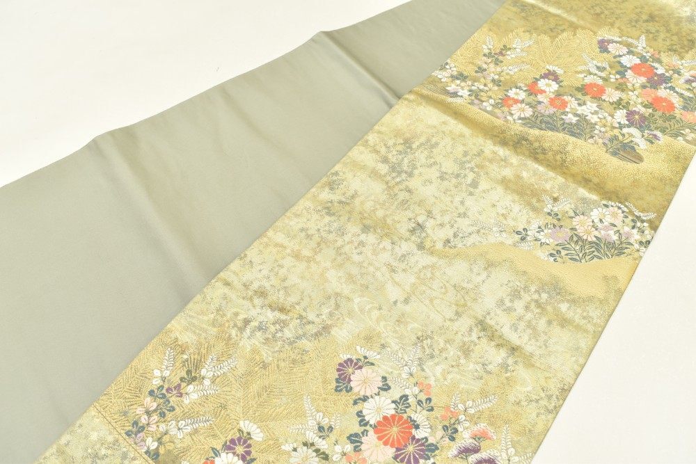 【商品説明】緑がかった金色に花鳥元禄文様が施された上品な袋帯です。 【シミ汚れ等の状態】 締め折れ線あります |