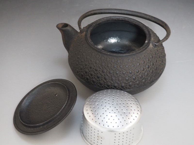 A4553 南部鉄器 岩鋳 造 霰紋 鉄瓶 瓶敷付 ☆ 茶道具 煎茶道具 茶器 煎茶器 鋳造 金属製 鉄製 鉄器 銚子 急須 鉄壺 鉄壷 茶注 茶次 良品 收藏