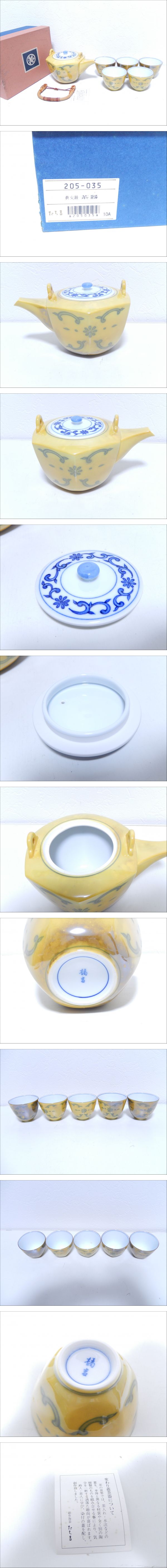 | 【管SH0670】500円~ 未使用 橘吉 たち吉 黄交趾 茶器揃 急須 湯呑 変わり蓋 茶器 5客揃 |