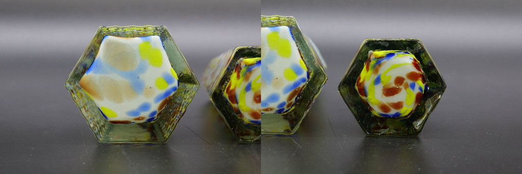 R-076606 昭和レトロ 戦前 大正 お部屋のアクセントになる古いマーブルガラス花瓶2個セット(六角、一輪挿し、花入、花器、硝子) 收藏