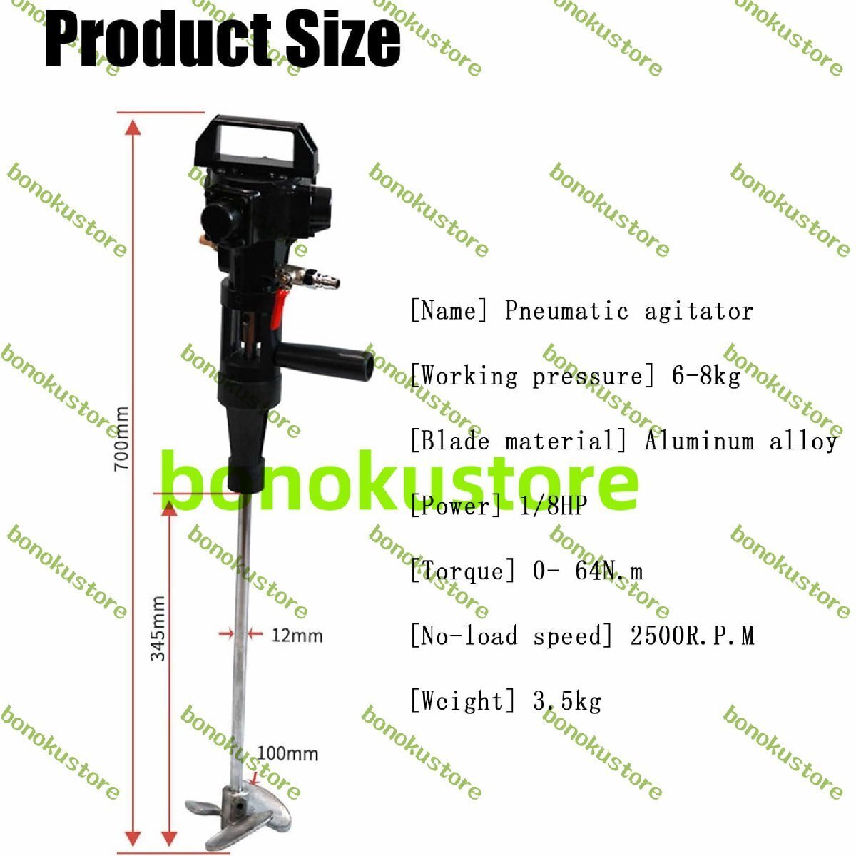 【名称】空気圧撹拌機 【作動圧力】6~8kg [ブレード材質] アルミニウム合金 【パワー】1/8HP [トルク] 0~64N.m [無負荷回転数] 2500R.P.M 【重量】3.5kg