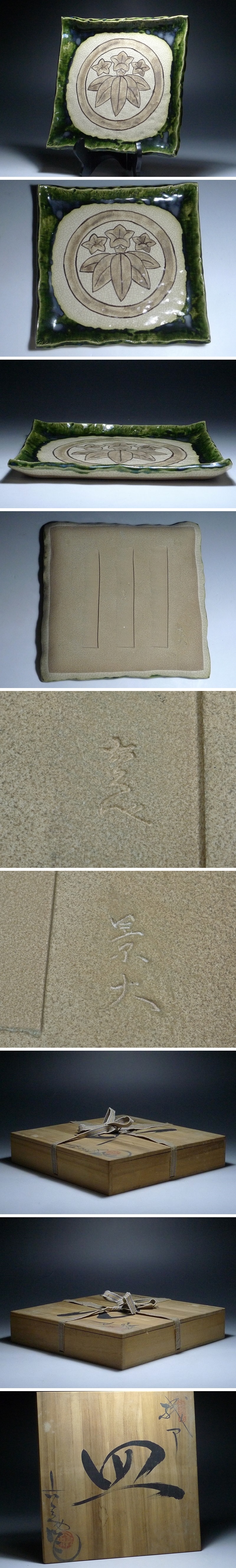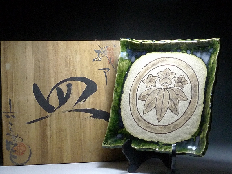 10MK109★六兵衛作・景大・長谷元窯 織部焼 皿・家紋「丸に笹竜胆」・共箱付き・角皿 大皿 盛皿 菓子皿 陶器 伝統工芸 古美術 收藏