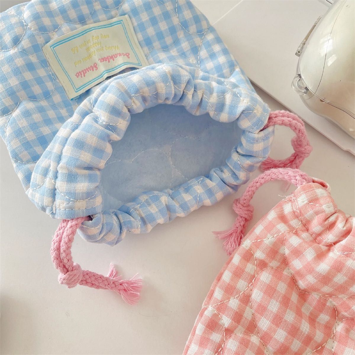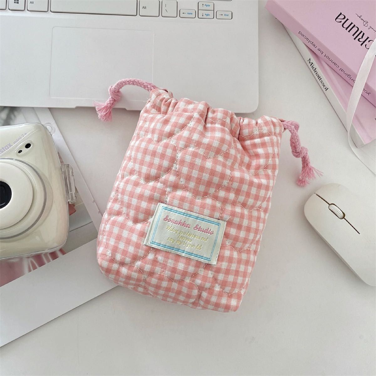 チェキ カメラ 収納 カバー 巾着袋 ポーチ キルト加工 韓国 グラウド ピンク ハート チェック ハンドメイド 收藏