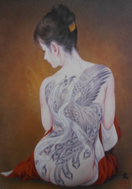 『送料無料です』◆美人画 アーティスト 小妻要 先生◆精密な刺青 作品名 羽衣と鳳凰 額縁付き 收藏