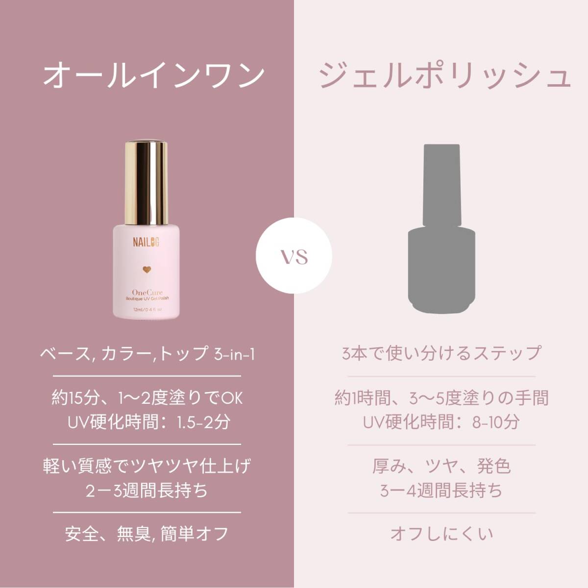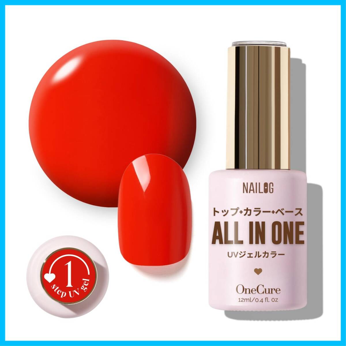 【革新的な3-in-1オールインワン】 Nailog OneCureジェルネイルポリッシュは、ベース・カラージェル・トップコートを1本に融合した革新的な3-in-1ジェルポリッシュです。ワンステップの簡単な塗布と硬化で、煩雑なトップ・カラー・ベースのプロセスを省き、サロン級の仕上がりを自宅で実現できます。