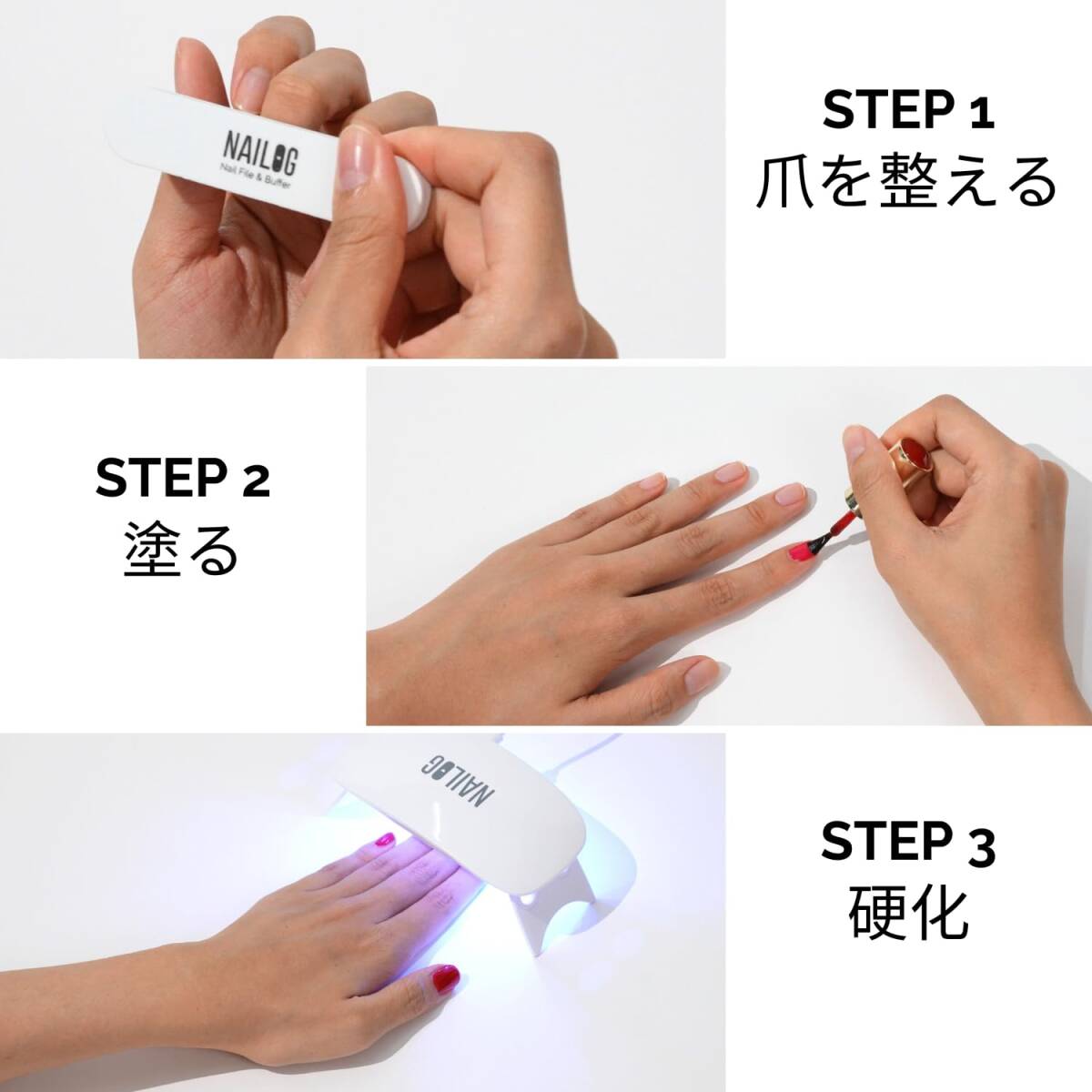 【安全性へのこだわり】 Nailog UVジェルポリッシュは、ヴィーガン処方・10種類の有害成分フリー・動物実験なし・低臭設計で、爪や肌に優しい安心の仕様です。安全にご使用いただくため、必ず使用方法を守ってください。 ・皮膚への直接の接触、吸入、誤飲、目への接触を避けてください。 ・万が一異常が発生した場合は、すぐに使用を中止し、医師の診察を受けてください。 ・お子様の手の届かない場所に保管してください。