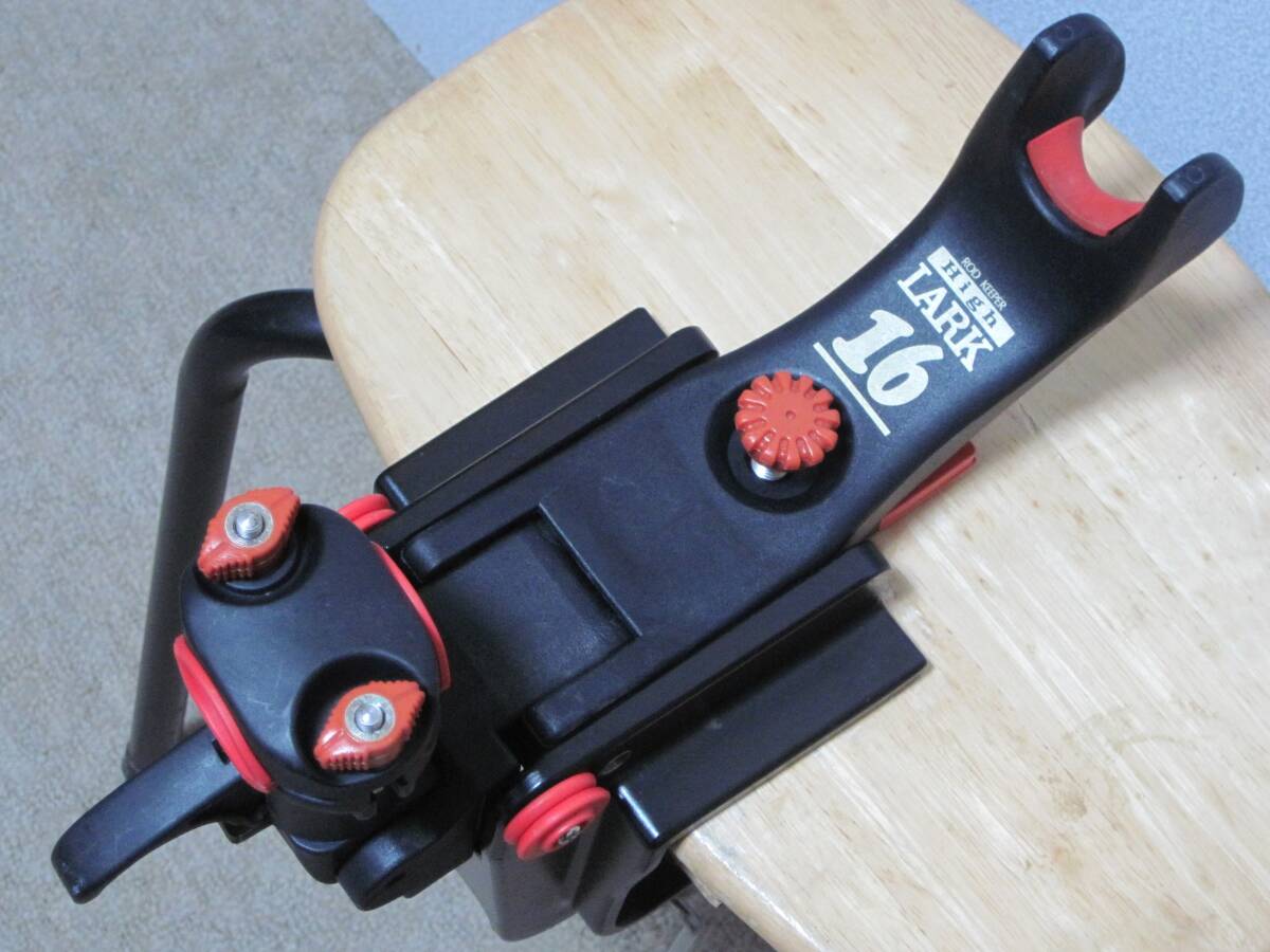 ご覧頂き大変有難うございます。第一精工製ロッドキーパーHigh LARK 16 の中古品となります。万力部はアルミダイカスト製で、アーム部は強化プラスチック製、大変頑丈な造りと成っています。アーム先端部とロッドホールド部の中心距離は230mmあります。船べりの厚みは9cmまで取り付け可能です。アーム部は跳ね上げることで手持ち釣りのサポートとなり、シャクリ釣り等に大変便利です。アームの高さ調整ネジ、ラインフックが付きます。さらにコンパクトにたためるのがこのロッドキーパーの特徴です。真鯛、鯵ビシ、イカ、イナダ、ワラサ、メジ・カツオ、またカンパチ、ヒラマサの泳がせ釣りなどに幅広く使用できます。