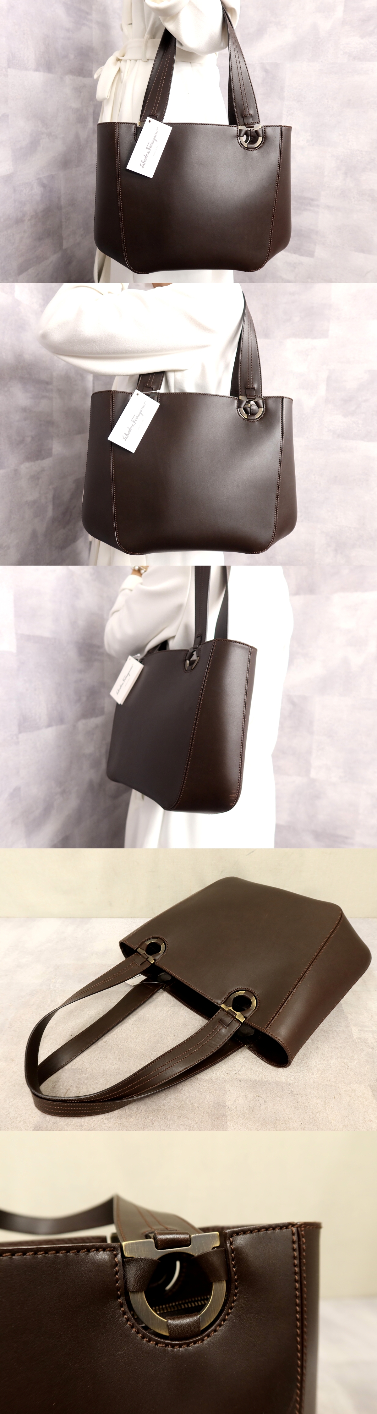 ●超美品●Salvatore Ferragamo フェラガモ●ガンチーニ●カーフ レザー 本革●トート ハンド バッグ●ダークブラウン●B5 収納●Js62198 收藏