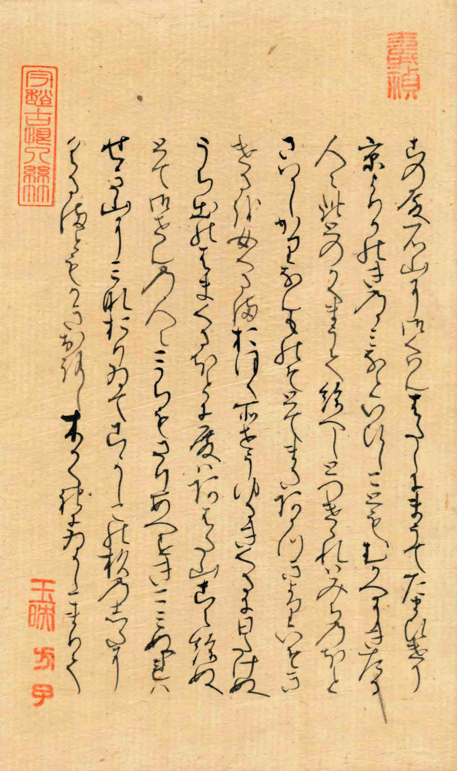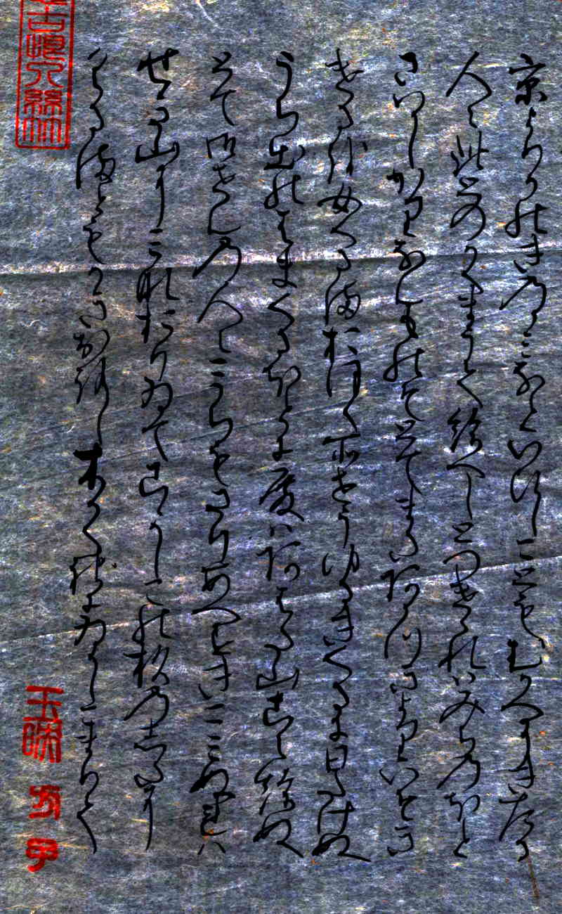 「関屋(せきや)」原本自筆上部には、「今愁古恨入絲竹」《今の愁(うれ)い古(いにしえ)の恨み糸竹(しちく)に入る》という漢文の篆書印が押捺されている。言葉の意味は、「今人の愁い、古人の悲しみ、楽の音に籠(こも)る」という内容です。紫式部がこの原詩に親しんでいたことがわかる。